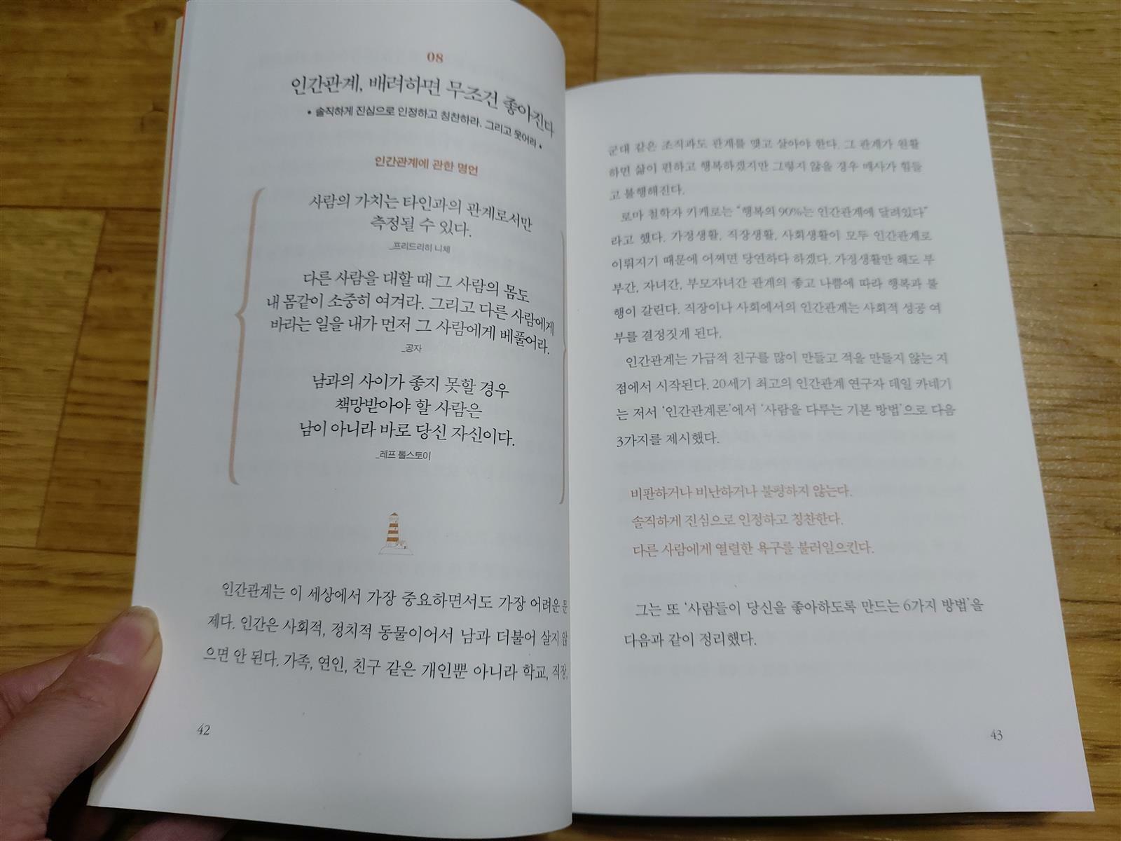 말 한마디로 인생의 전환점이 되기도 하니 명언들을 통해 삶을 돌이켜볼 수도 있고 삶을 어떻게 살아가야할지 방향을 알 수 있더라구요 삶의 나침반이 되어줄 인생명언은 행복, 사랑, 성공에 대한 명언 한 마디로 생각의 전환이 되었어요 인내는 필연적으로 고통을 수반하기에 인내란 참 어려워서 육아에도 너무 힘이 부칠 찰나 목표를 위해 계속 실패를 거듭해도 실패에 굴하지 않은 위인들을 보니 제 자신을 돌아보게 되면서 마음을 다 잡게 되더라구요^^ 그냥 글이었으면 그냥 지나쳤을지도 모르는 글일지도 모르는데 명언들로 묶어 놓아서 더욱 관심이 가고 집중적으로 보게 되는 거 같아요 인간관계에서 문제가 있을 경우 책망받아할 대상이 바로 자신이라는 명언에 뜨끔하고 저를 더 되돌아보게 되었어요 삶의 나침반이 되어줄 인생명언은 명언들과 예시도 나오고 또한 방법까지도 설명이 되어 있어서 두고두고 봐도 유용하네요 다시 되돌릴 수 없는 일을 후회하며 아깝게 보내는 시간이 많고 그 생각때문에 자신을 힘들게 할 때도 있는데 쇼펜하우어의 "후회는 자신을 고문하는 것" 이라는 글을 보고 그 동안 내가 나를 나무나 힘들게 했다는 것을 깨달았네요 과거를 후회하지 않고 현재를 열심히 살아야겠다고 느꼈어요 약속은 지키지 못할 거면 하지않는 게 낫고 약속을 지키지 못해 신의를 잃은 것보다 거절하는 게 나아요 아이를 올바르게 키우고 싶지만 약속을 쉽게 잊거나 지키지 못할 때가 더러 있는데 약속을 지키지 않으면 거짓말하는 것을 가르치는 것이라니 뜨끔하더라구요 작은 약속이라도 지킬 수 있는 것만 해야겠네요 삶의 나침반이 되어줄 인생명언은 살아가면서 의지가 조금 흔들린다 싶을 때 마음을 다시 잡아주게 되어 가까운 곳에 꽂아두고 읽고 싶은 책이에요^^ 도서를 제공받아 작성된 후기입니다
