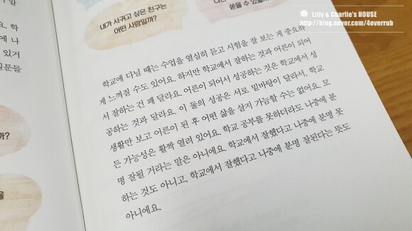 어쩌면 우리는 학교에서 이러한 질문들을 스스로 할 수 있을 만큼 생각의 크기가 성장하는 것이 가장 중요한 것일 수도 있을 것 같아요 어른들이 말하는 백점짜리 인생은 사실 사회에 나가서는 기준이 조금 달라지죠 엄마 아빠가 원하는 일등 그리고 선생님이 원하는 완벽한 학생 이러한 모든 조건을 만족시킬 수는 없어요 그렇다면 어떻게 해야 할까요?