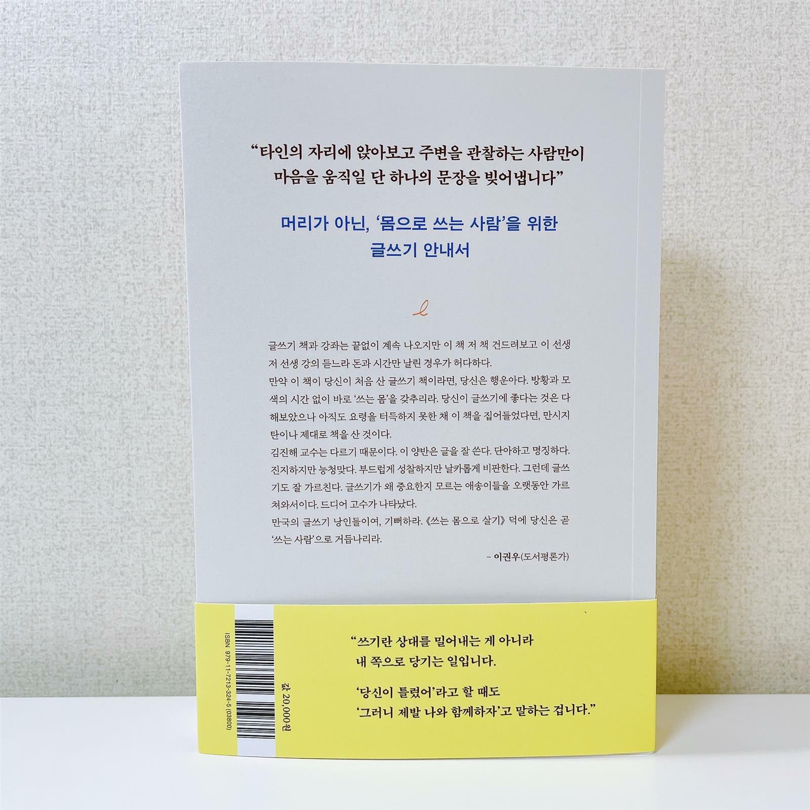 글을 쓰고 싶지만 시작이 막막했던 사람, 마음처럼 써지지 않는 글 때문에 연필을 잡기가 두려웠던 사람이라면. 〈쓰는 몸으로 살기〉로 꼼꼼하게 풀어놓은 ‘잘 쓰는 법’과 함께, 따뜻하게 와닿는 김진해 교수의 응원과 격려를 만나 보면 좋을 듯하다.