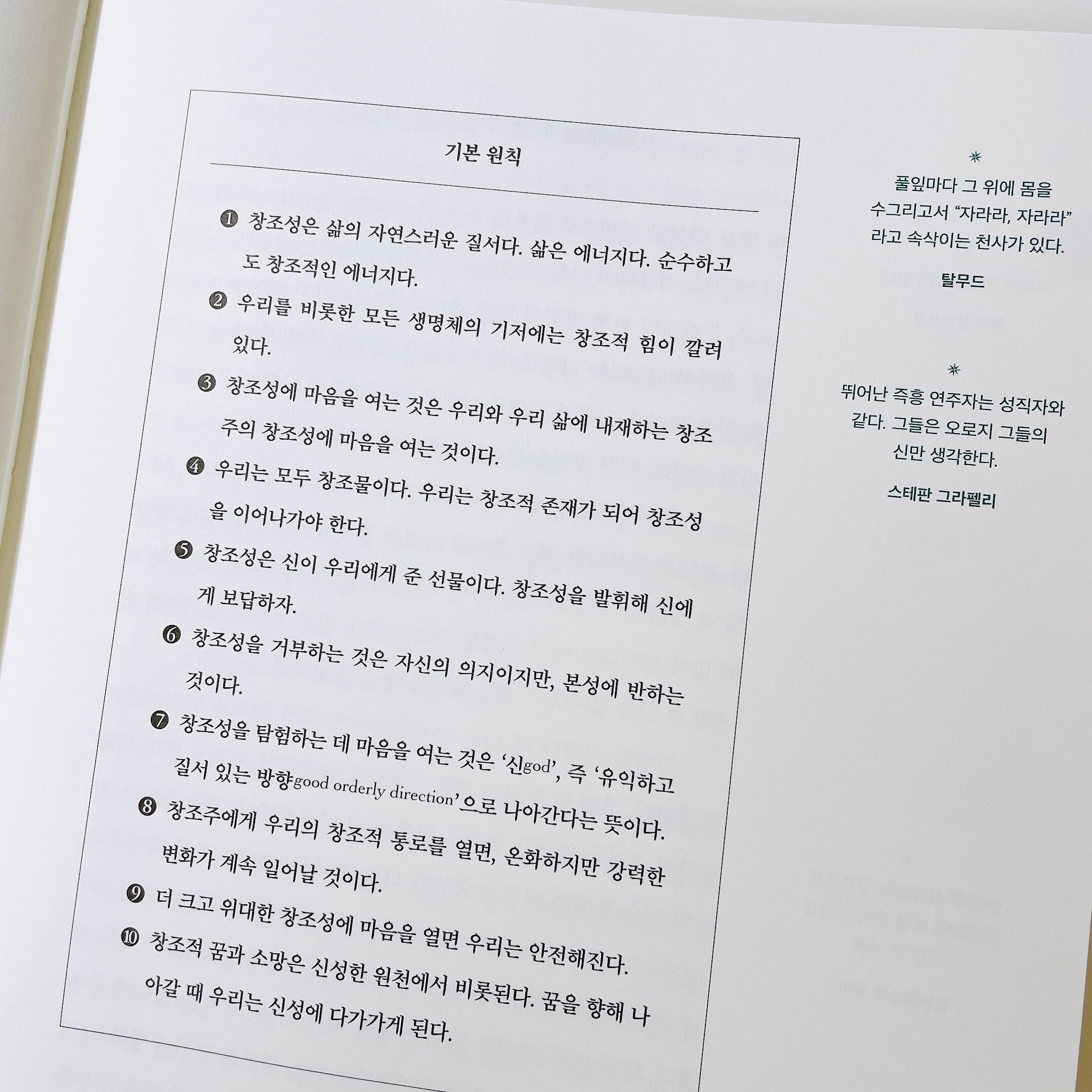 〈아티스트 웨이〉는 내면의 창조성을 회복하는, 줄리아 캐머런의 야심찬 12주 프로그램을 담고 있다. 캐머런은, 우리 모두는 원래 창조적인 존재였지만 잠시 그걸 잊은 탓에 내면의 창조성을 끌어내지 못하는 것이라고 이야기하는데. 안정감, 자기 정체성, 내면의 힘, 진실성, 가능성, 충족감, 연대감, 강점, 연민감, 자기 보호감, 자율성, 신념. 매주 하나씩, 각 장에서 다루고 있는 것들을 회복하는 작은 미션을 수행하며. 독자는 자신에게 내재된 창조적 에너지를 마주하게 된다는 것이 그의 설명이다.