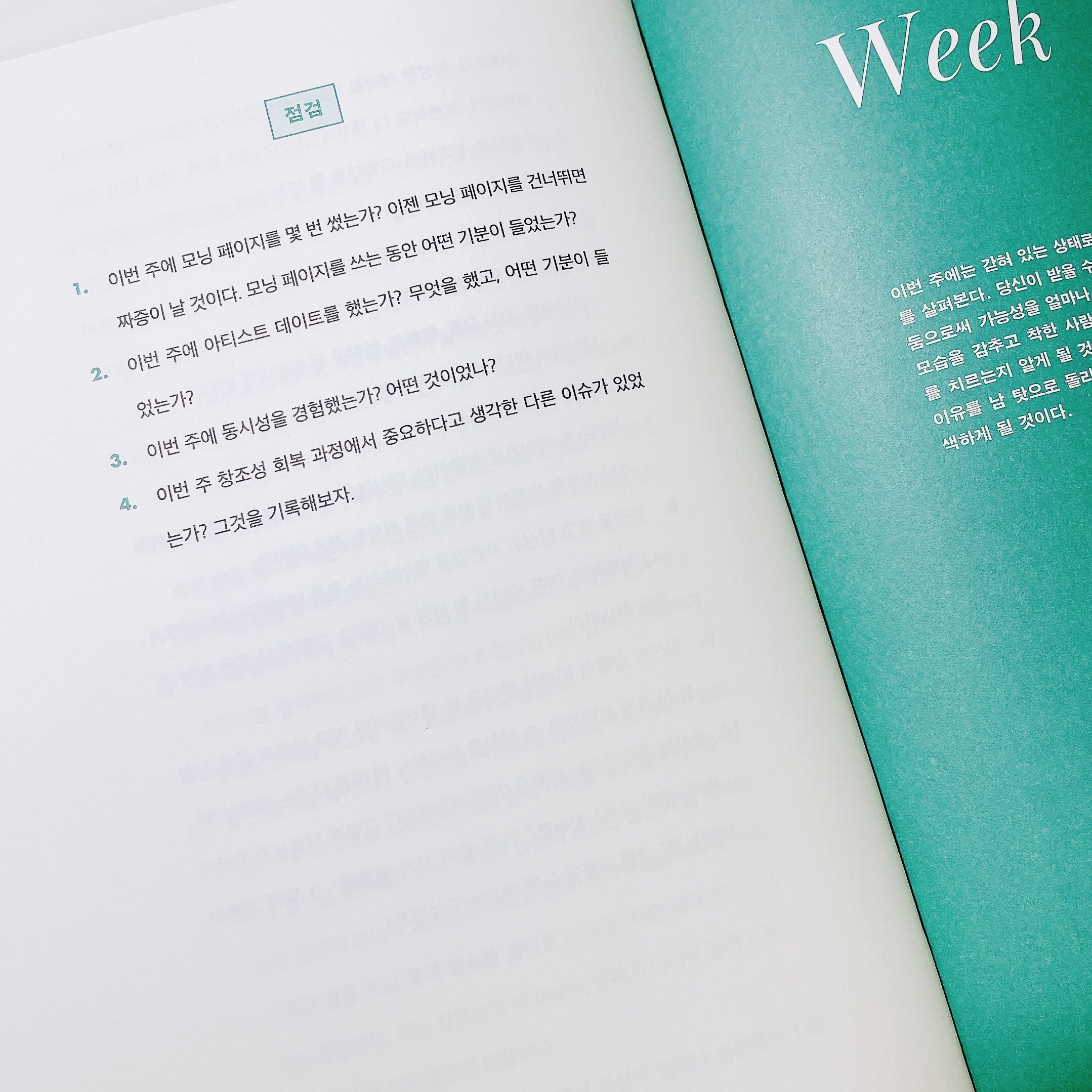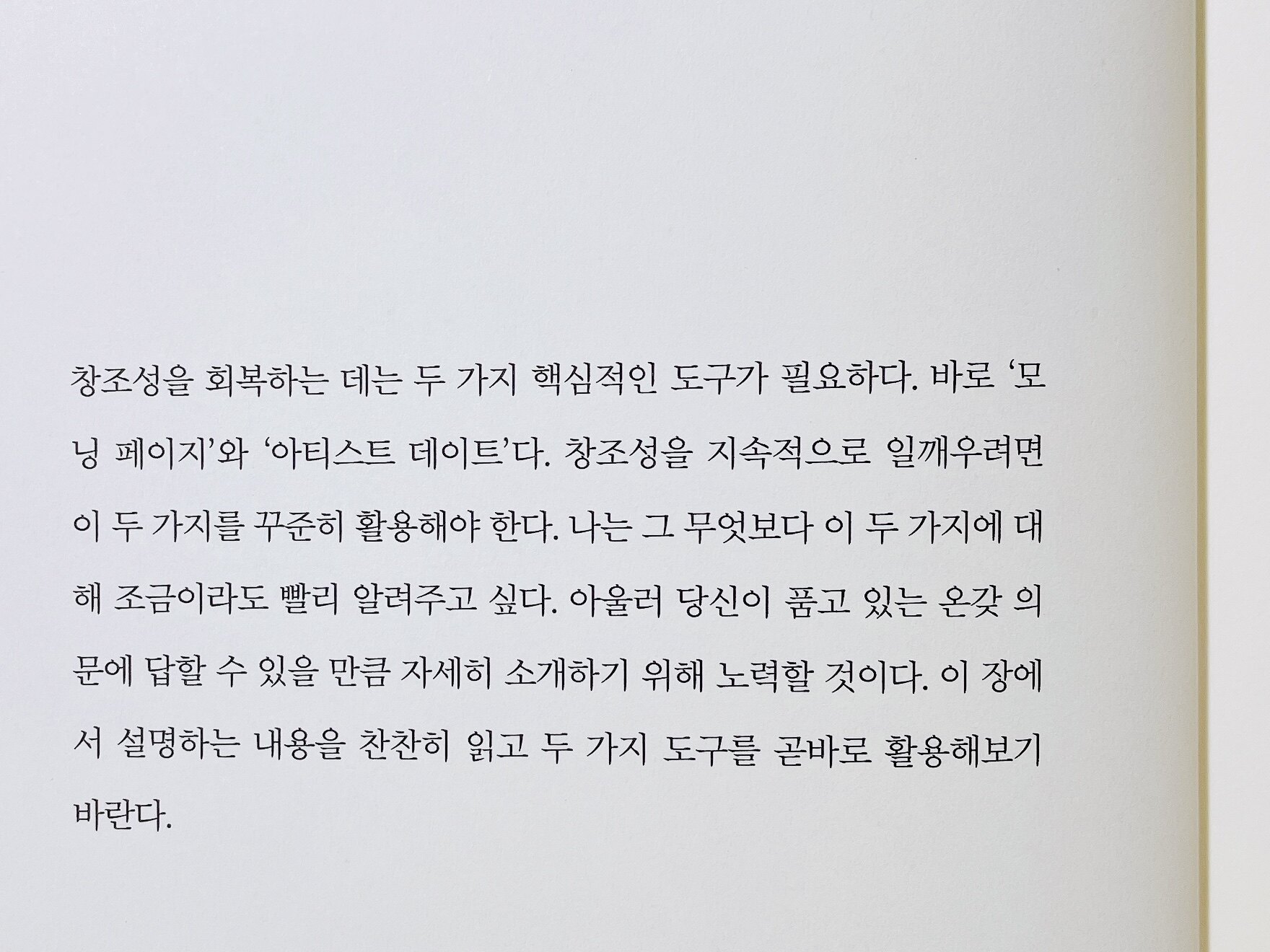 본격적인 창조성 회복 과정에 들어가기 전. 지은이는, 꾸준하게 창조성을 일깨우기 위해 이 여정을 함께 해야 할 중요한 도구로 ‘모닝 페이지’와 ‘아티스트 데이트’를 강조한다.