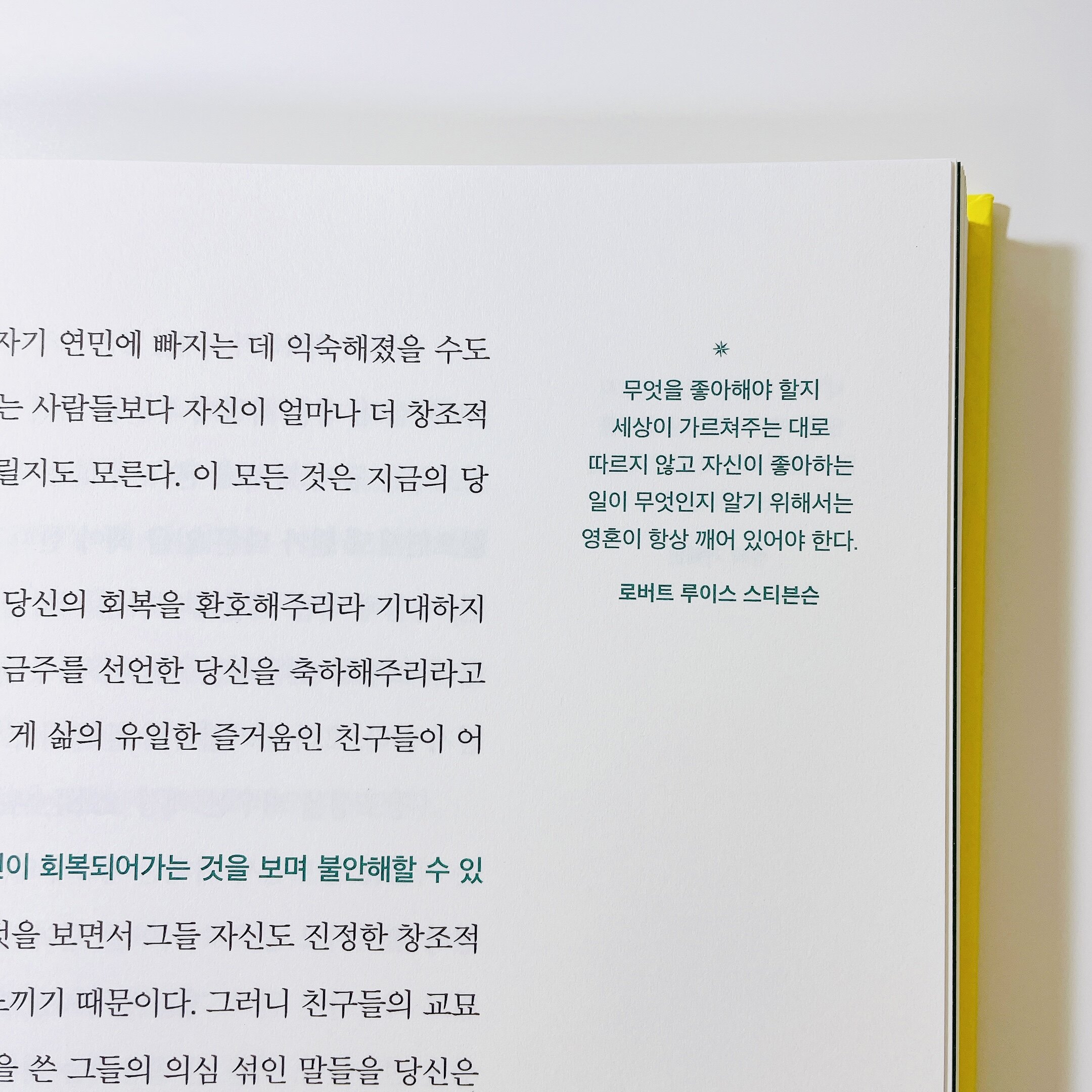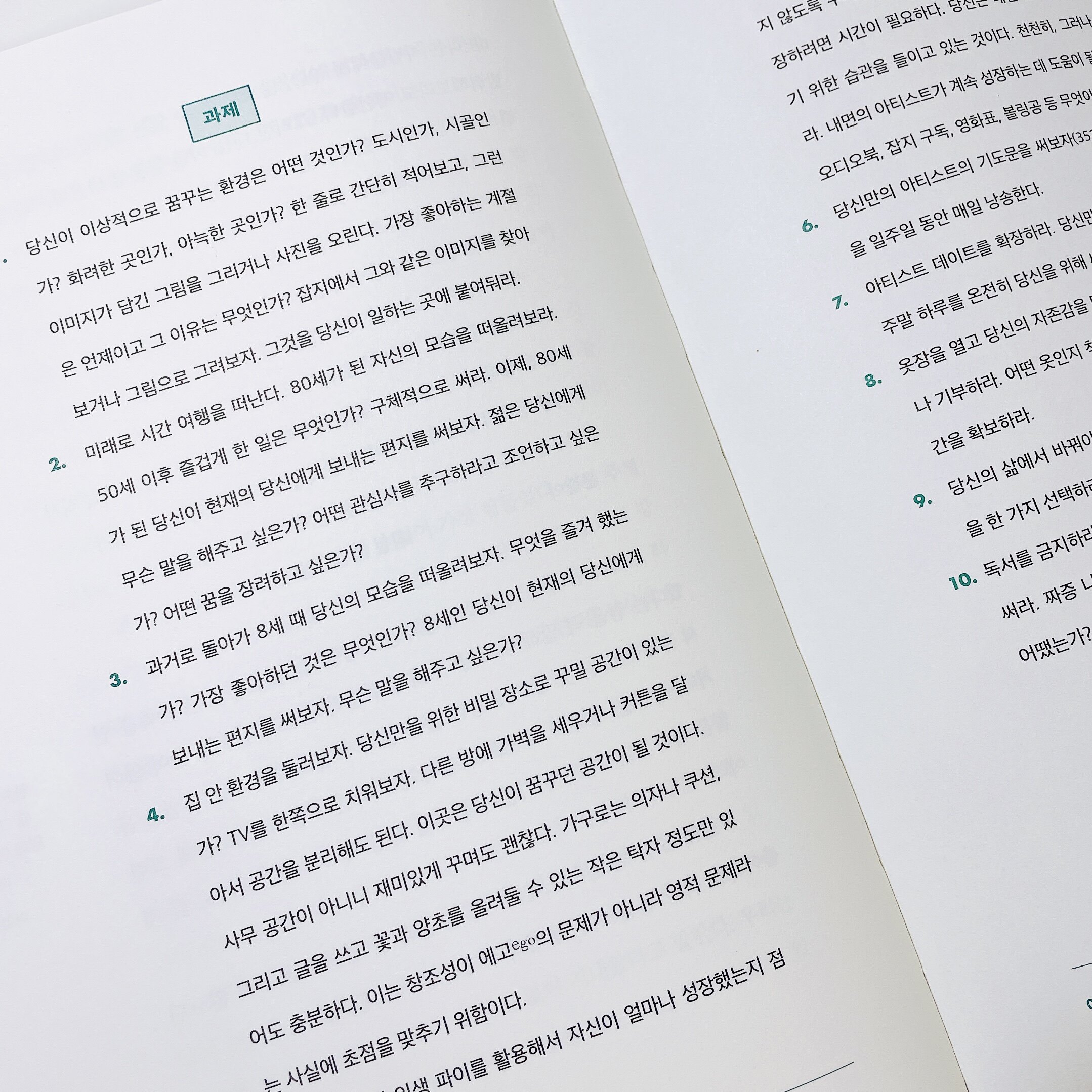 〈아티스트 웨이〉는 평범한 일상에 작은 활력을 불어넣는다. 저자가 소개한 12주간의 창의력 회복 프로그램을 따라 매일 아침 ‘모닝 페이지’로 복잡한 생각들을 쏟아내고, ‘아티스트 데이트’를 통해 내면의 어린 아티스트를 기르며. 포장을 걷어낸 솔직한 내 마음을 들여다보고, 이전엔 보지 못했던 ‘새로운 나’의 모습을 발견할 수 있었다. 머릿속을 가득 채운 생각들과 심한 감정 기복으로 고민이라면, 줄리아 캐머런의 〈아티스트 웨이〉와 함께 마음의 소리에 귀를 기울여 보는 것도 좋겠다.