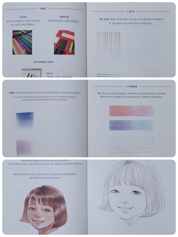 사용한 재료와 미니레슨으로 색칠하는 방법이 설명되어 있어요.