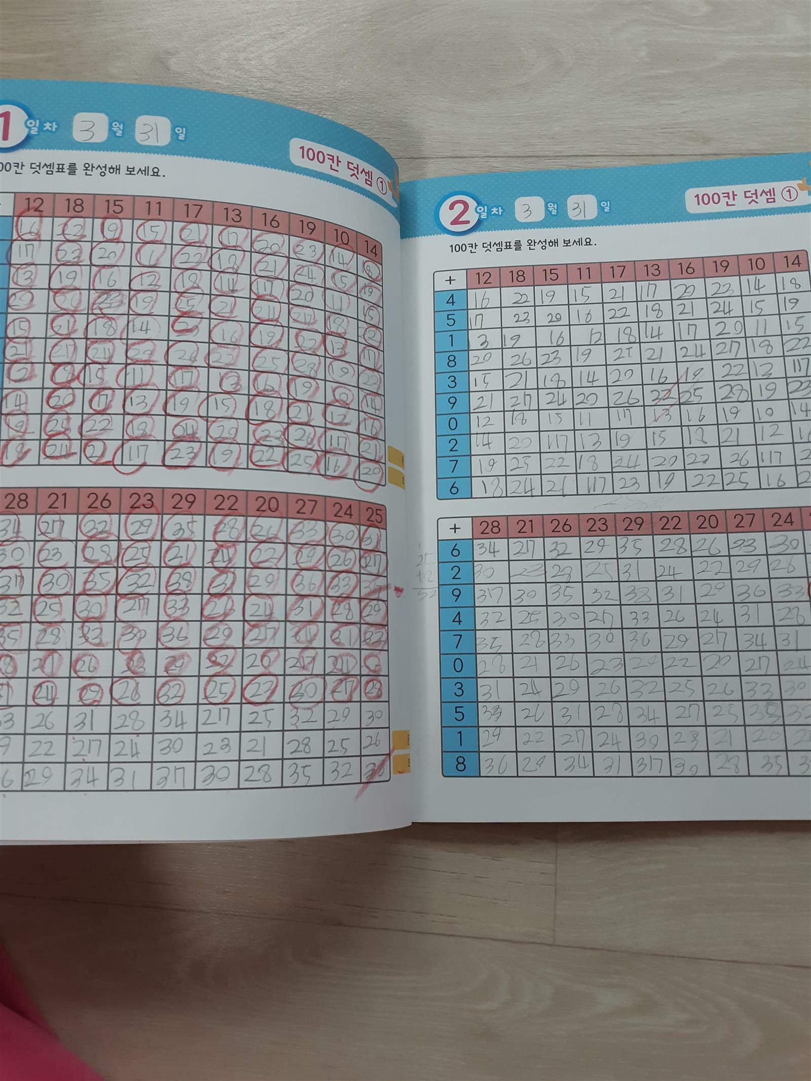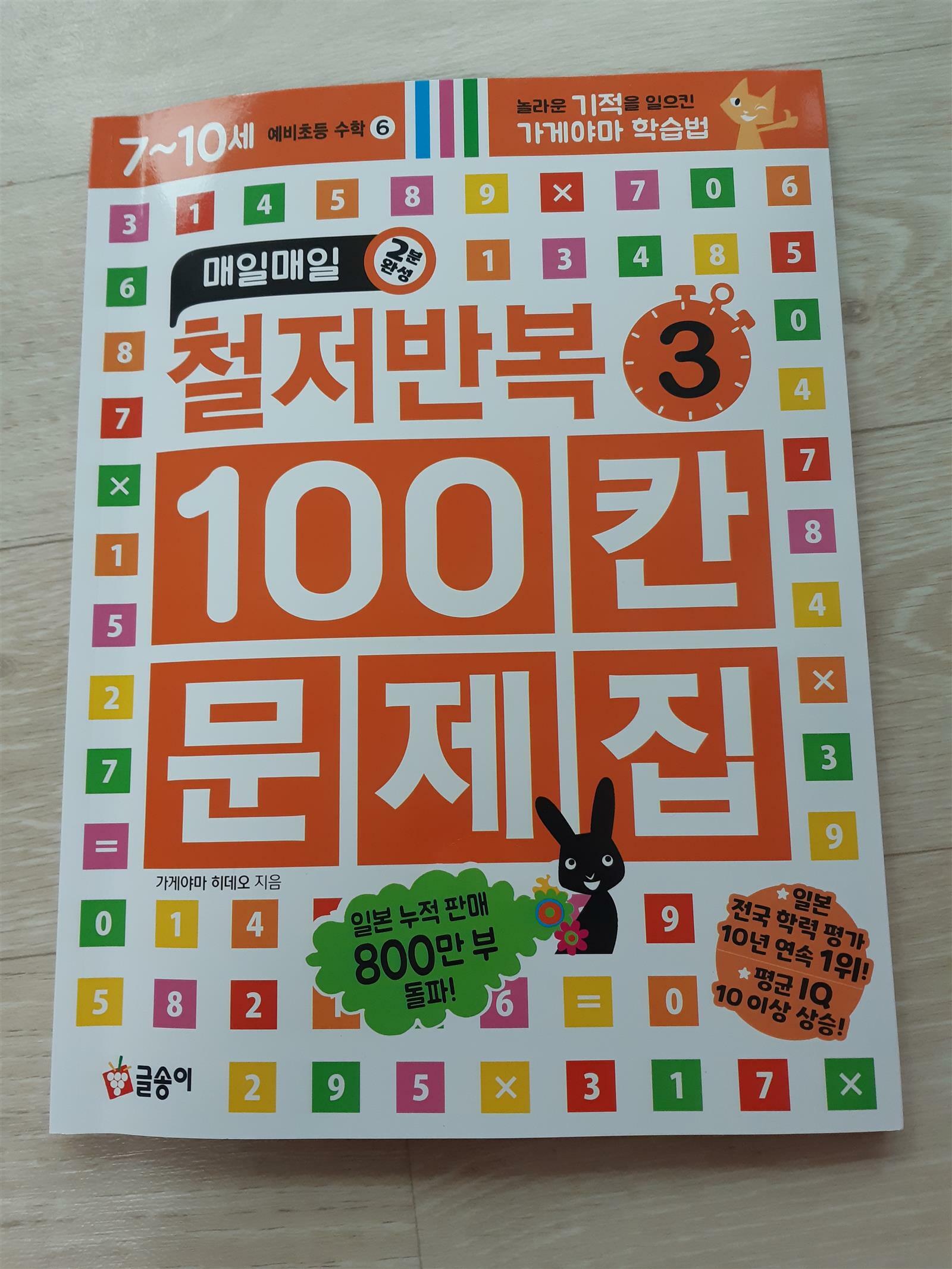 덧셈, 뺄셈, 곱셈, 나눗셈이 출제된 문제집이고, 색깔을 보고 구분해서 더하기나 빼기를 할수 있어서 아이 눈높이에 잘 맞는것 같아요. 그리고 100칸 덧셈이 똑같이 옆에 다시 문제가 나오고, 100칸 뺄셈이 나오는데 뺄셈도 덧셈과 마찬가지로 옆에 똑같이 문제가 다시 나와요. 100칸 곱셈이 나오고, 옆장에 또 똑같은 문제가 있네요. 세로셈 덧셈 뺄셈과 세로셈 곱셈 나눗셈이 나오네요. 더 자주 반복적으로 풀게하는 학습법이에요. 문제집 제목에서도 볼수 있듯이 매일매일 철저반복이라는 글이 실려있듯..철저반복하게 하는 학습법이고, 7~10세용이라 그런지 조금더 레벨이 올라가서 더 꼼꼼함을 바라는 문제집이기도 하네요. 그리고 시간을 재더군요. 앞장보다 몇초 빨리 풀었는지 확인해보라는 것은 시간이 중요하다는걸 알려주는 것 같아요. 매일 반복하면서 푸는 속도도 조금씩 빨라질수 있게 유도하는것 같기도 하지만 매일 반복적으로 푸는게 아무래도 속도가 빨라질수 밖에 없는것 같기도 해요. 왜 일본 전국 학력평가 10년 연속 1위! 평균 아이큐 10이상 상승! 타이틀을 가지고 있는지 알수 있네요. 반복하면서 집중력도 키우고, 어린 아이 눈높이에도 맞고, 문제집을 안 풀수도 없고, 계속 풀게 만들고, 간편하고, 쉽고, 정말 좋은 문제집이네요. 초등학교 저학년까지 계속 반복적으로 풀면 수학이 어렵진 않겠어요. 솔직히 간단하고 반복되는 문제집이라서 서평을 어떻게 작성해야 하는건가? 고민이 많았어요. 보시다시피 계속 반복적으로 문제가 나오고, 칸이 점점 더 많아지는것 외에는 쓸게 없긴 하는데..이렇게 간단한데도 학습효과과 좋으니 ..왜 가게야마 학습법 하는지 알겠어요. 아이가 저절로 가서 풀으니 엄마입장에서는 마음이 편하고, 수학을 접하는 태도가 쉬워서 아이가 수학과목을 좋아할것 같아요. 저처럼 수포자가 안되길 바라네요.