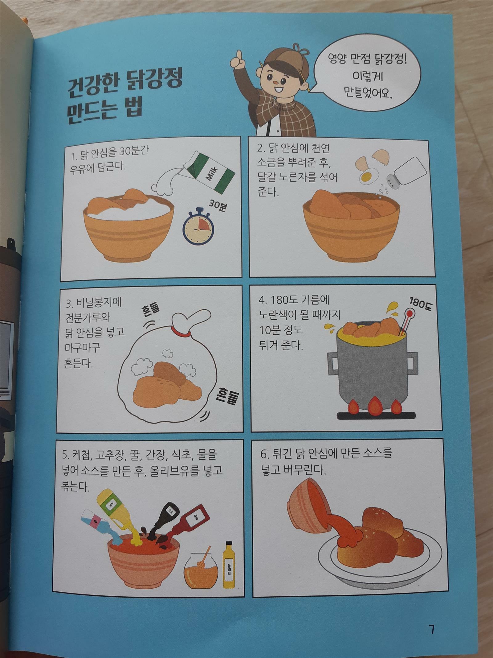 명탐정 닭다리 탐정의 주인공들을 살펴볼까요? 닭다리 탐정과 조수인 박조수와 요리사 금먹방씨와 그의 아들 금주방, 중국요리 전문가 장요기와 중국요리 전문 요리사 넘버투, 그리고 대회참가자들이 있어요. 닭다리 탐정은 닭다리를 제일 좋아하고, 아침부터 닭강정을 먹는데..건강한 닭강정을 만드는 법 레시피도 있고, 책 읽는 독자들한테 좋은 정보네요.