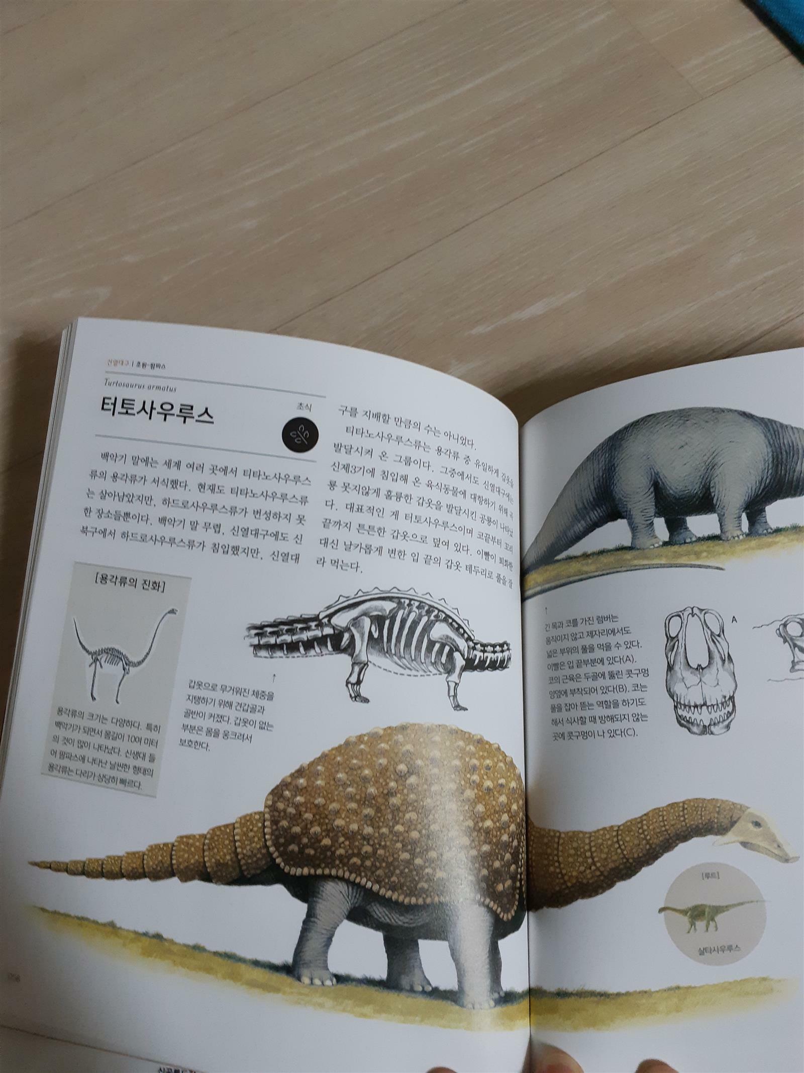 만약에? 정말 공룡이 멸종하지 않았으면 인간들은 어떤 모습으로 지구에 살고 있을지 궁금하네요? 공룡과 공생하면서 잘 살수 있을까요? 아니면 공룡을 무서워하면서 숨어 살까요? 아니면 무기와 첨단과학을 이용해서 공룡을 격리시켜서 살고 있을까요? 공룡이 살아 있어서 기쁘기도 하지만 한편으로는 걱정이 많이 되기도 하네요. 신공룡 도감 책은 공룡이 멸종하지 않고, 진화한 공룡들의 '만약에' 도감책이라는데..작가의 상상력이 책에 어떻게 구현되어 있을지 궁금하네요. 신공룡 도감책을 살펴보면 우선 예전 공룡의 모습과 비슷한 공룡들도 있고, 다른 모습으로 진화한 공룡들도 있고..다양하고 신기하기도 하네요. 전 개인적으로 초식공룡을 좋아해요. 그래서 그런지 터토사우루스가 제 눈을 사로잡네요.