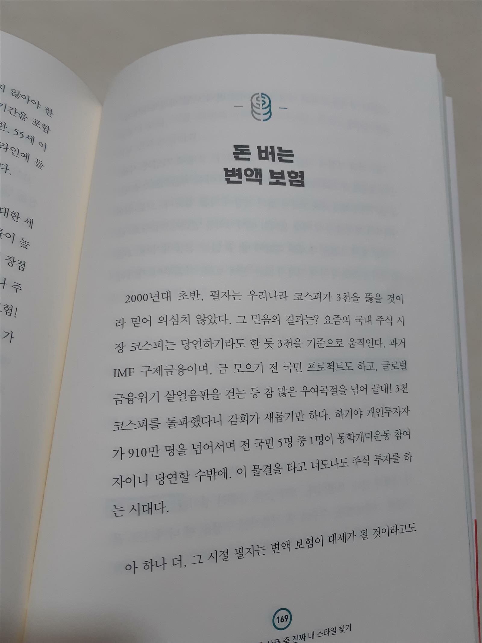 책 제목처럼 누구나 할 수 있는 재테크 책입니다. 책을 읽어보니 제가 기존에 알고 있는 내용들도 많고, 모르고 있던 새로운 내용을 알게 되어서 기분이 좋아요. 아는게 힘이다 라는 말이 있듯..모르고 있는 것 보다는 알고 있는게 살아가는데는 도움이 돼죠. 아이 둘을 키우는 엄마로서 많은 도움이 되는 내용들로 채워진 책이라는 생각이 드네요. 노후 준비와 아이들 교육비를 생각하면 재테크를 무시하고 살기란..미련한 행동이 될 수 밖에 없겠죠? 노후와 아이들 교육을 위해서라도 재테크, 돈 관련된건 항상 공부하고, 책을 읽고, 가족들과 대화를 자주 해야 할 것 같아요. 재테크에 대해 아이들에게도 자연스럽게 가르치고 싶어요. 그럴려면 엄마인 제가 공부를 열심히 해야 하겠죠? 제가 지금하고 있는 재테크는 저축과 앱테크가 다여서..앞으로 어떤 재테크를 해야 할지 고민중에..책에서 변액보험과 연금보험이 눈에 들어오더라구요.