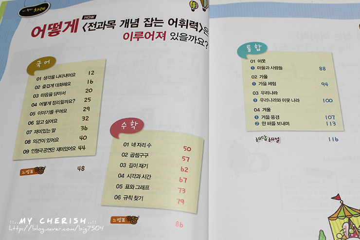 국어, 수학, 통합 교과 타이틀로 이루워져 있어