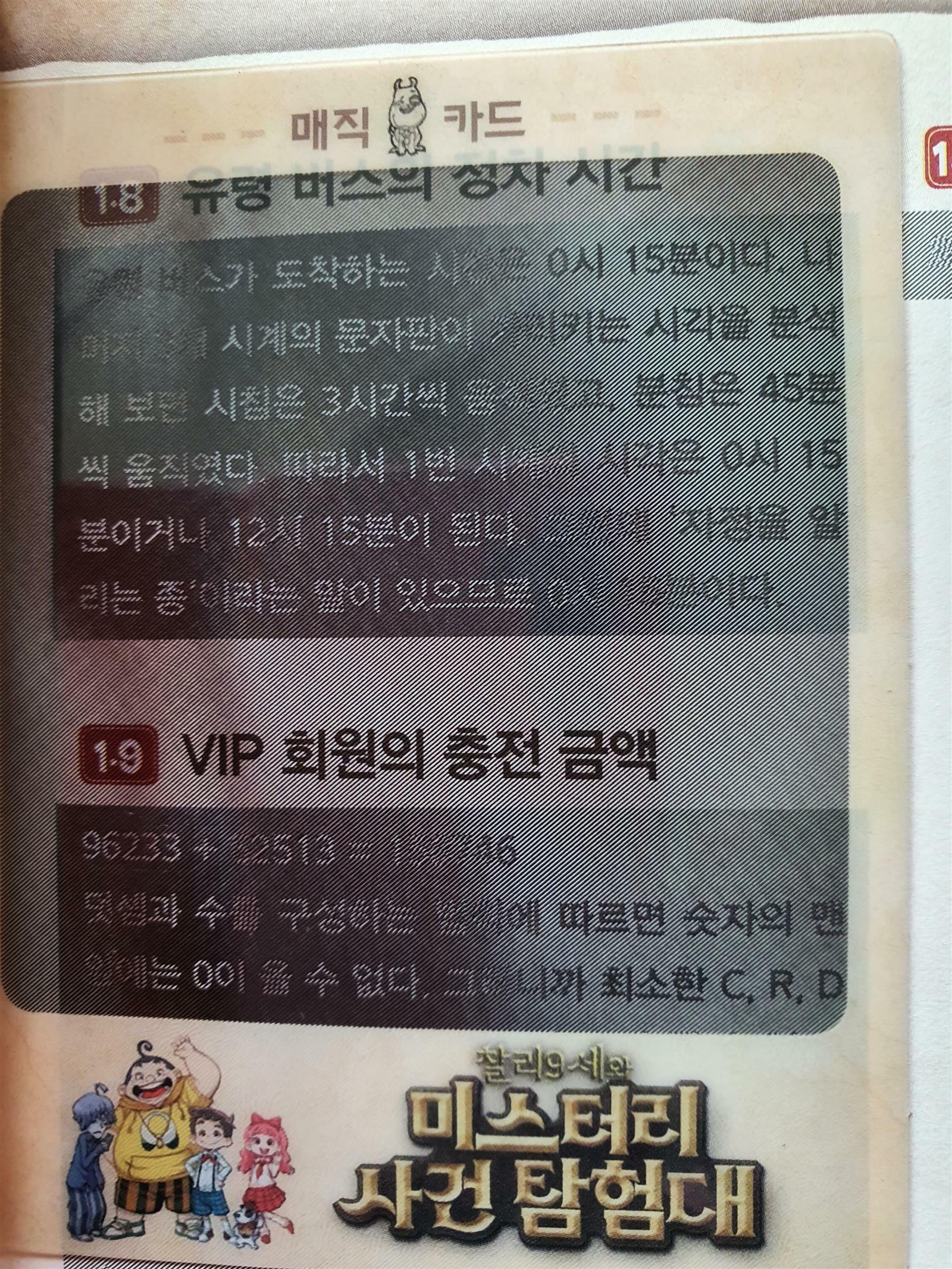 자~~ 매직카드를 들고, 회색 부분 위에 올려놔 봅니다. 그럼 글씨가 보이시죠? 정답 뿐만 아니라, 어떤 식으로 문제를 해결했는지, 해결 방법이 해설이 되어서, 궁금증을 해결할 수가 있어요.
