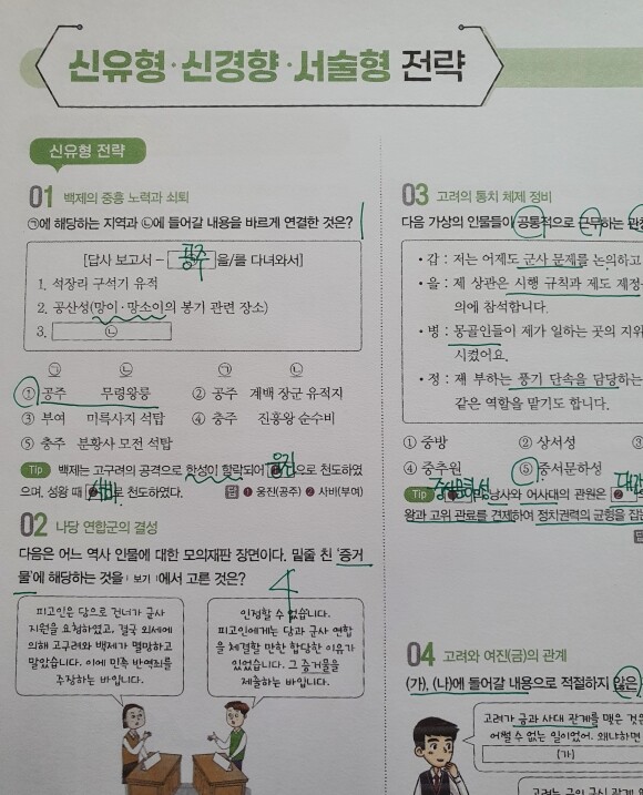 그냥 정리가 되어 있는 것이 아니라 중요한 역사용어들을 끼워 넣도록 하였어요. 생각이 안 나도 괜찮습니다. 물론 외워서 적어야 하지만, 그 페이지 안에 정답이 써 있으니, 보고 쓰고 외워도 되요. 일단 개념 정리라고 할 수 있지만, 아예 문제부터 시작하는 문제집이네요.