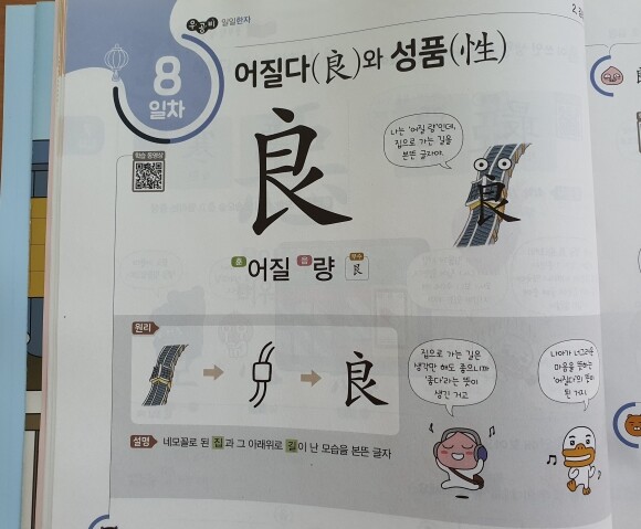 표지를 보면 학습동영상을 제공하는 QR코드가 있습니다. QR코드를 찍으면 한자의 훈과 음, 제자원리, 필순 등을 학습할 수 있습니다.