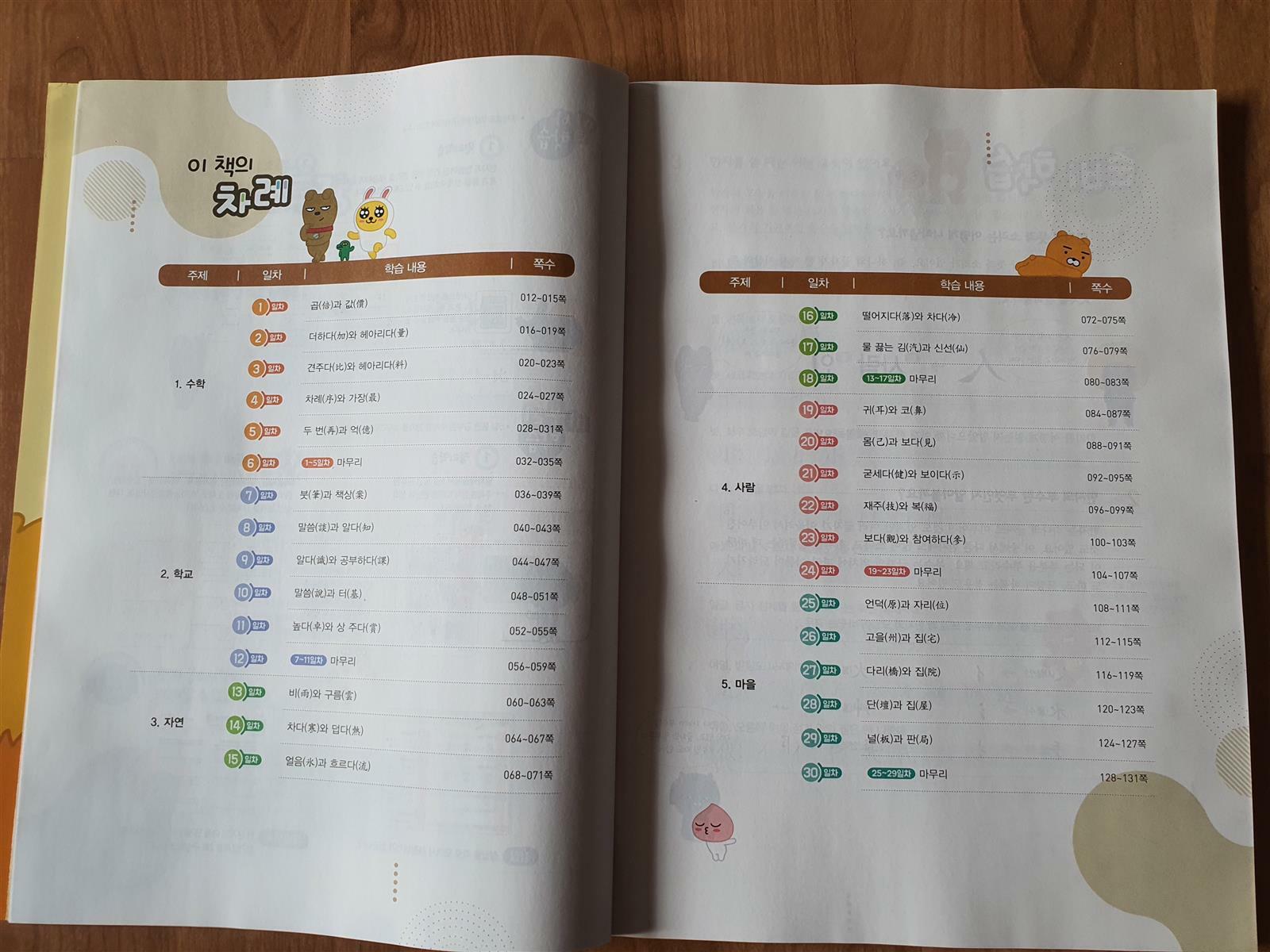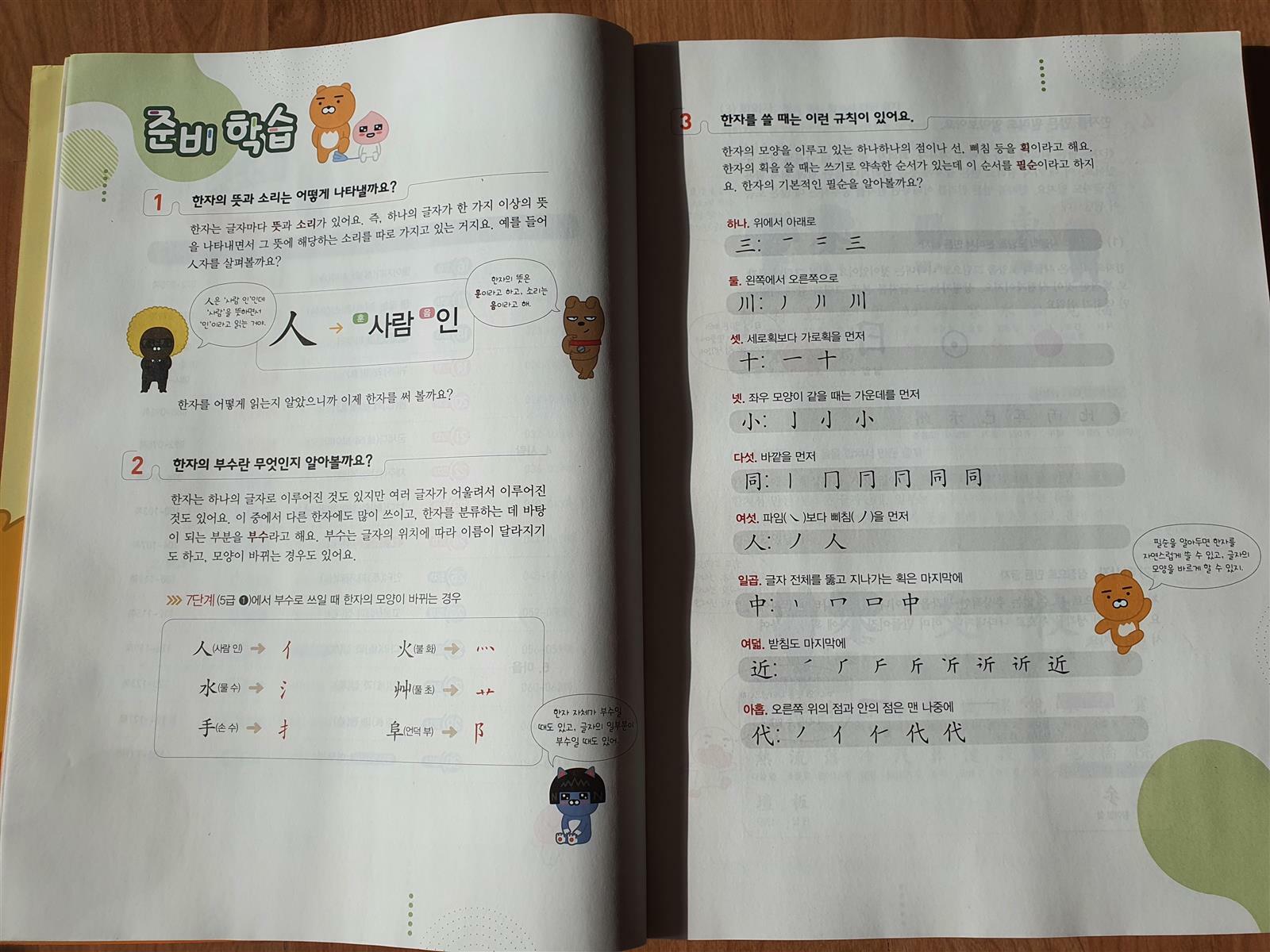 한 페이지에 걸쳐서 카카오 프렌즈 친구들이  그동안 배워왔던 한자의 모양과 음과 훈을 한 번 더 상기시켜 줍니다.