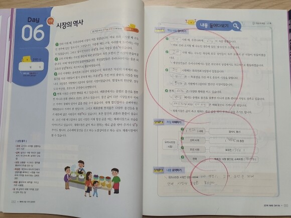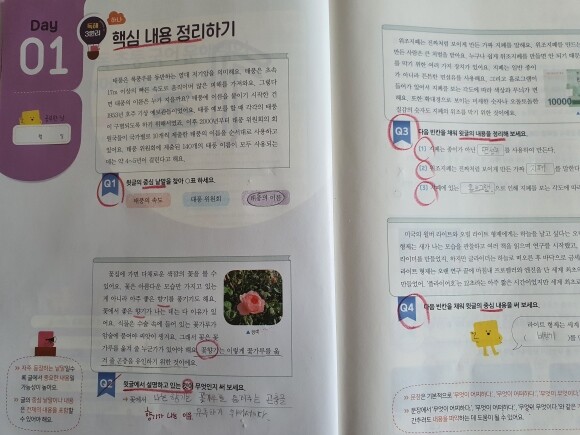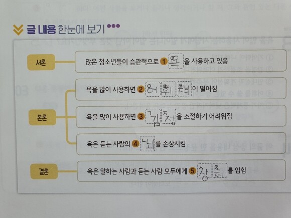 글 내용 한눈에 보기를 보고서 부담 없이 핵심 단어만 지문에서 찾아 넣지만, 그런 활동들을 통해서 독해를 하는 요령을 습득할 수가 있어서 참 좋더라고요.
