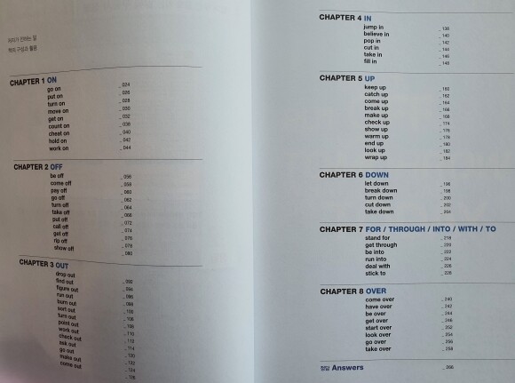 <p>전치사의 뜻과 속성이 그 의미에 많은 영향을 미치기 때문에 전치사 대로 분류하는 것이 구동사의 뜻을 외우는데에 효율적이네요. ^^</p>