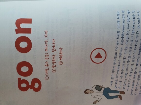 <p>go on이라는 구동사를 공부하기 위해서, 책을 펼치면 커다란 활자체가 눈에 확 들어 옵니다. </p>