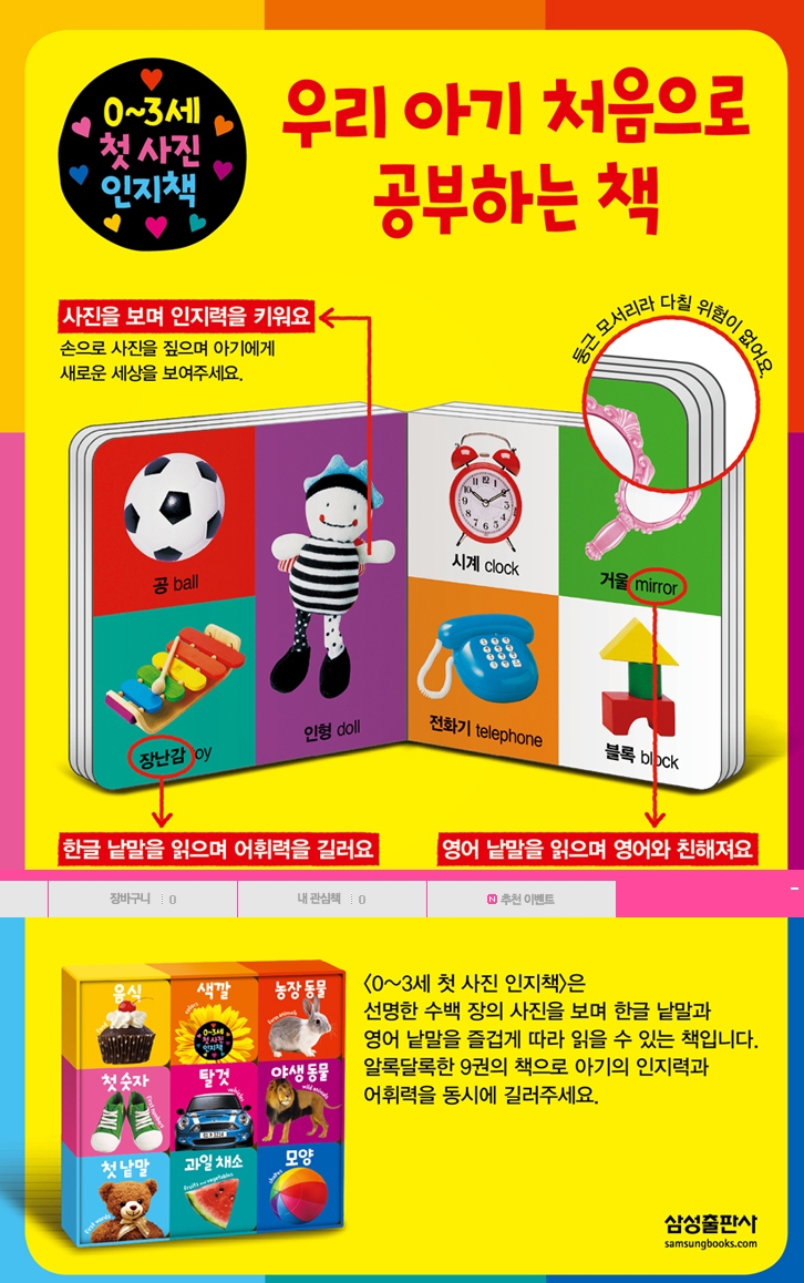 <0~3세 첫 사진 인지책>은 우리 아이들의 사물 인지와 어휘력 신장에도 도움이 될거에요.