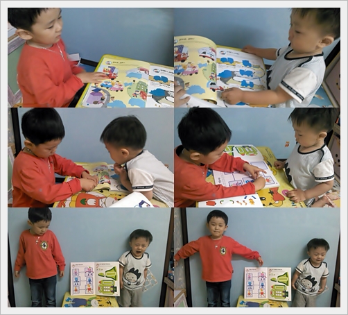 사이좋게 마주앉아 번갈아 가며 스티커 붙이는 중이신 형제~