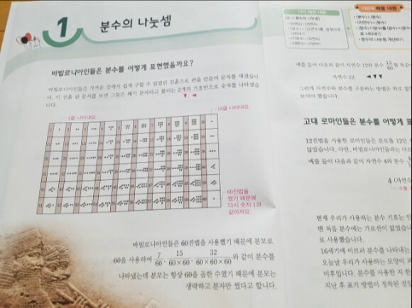 단원을 들어가는 코너에서는 분수와 관련된 흥미로운 수학이야기를 알려주고 있구요.