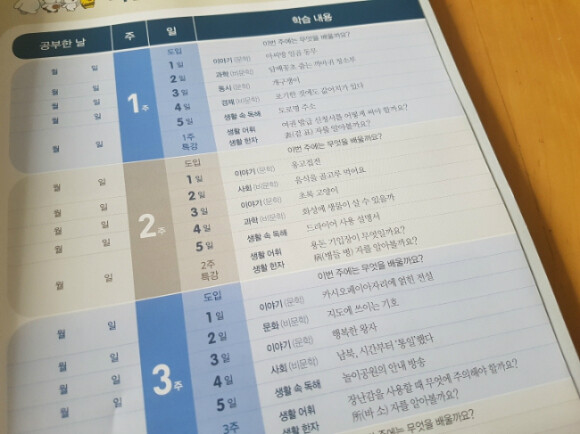 각 주별로 문학, 비문학, 생활 속 독해와 생활 어휘, 한자까지 다양하게 공부할 수 있도록 해준답니다.
