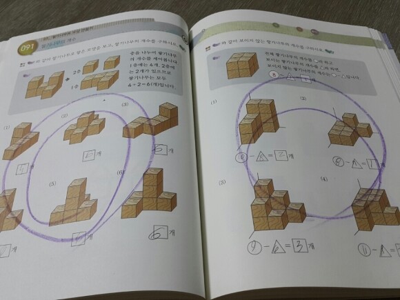 처음에는 쌓기나무로 모양 만들기가 나오는데
