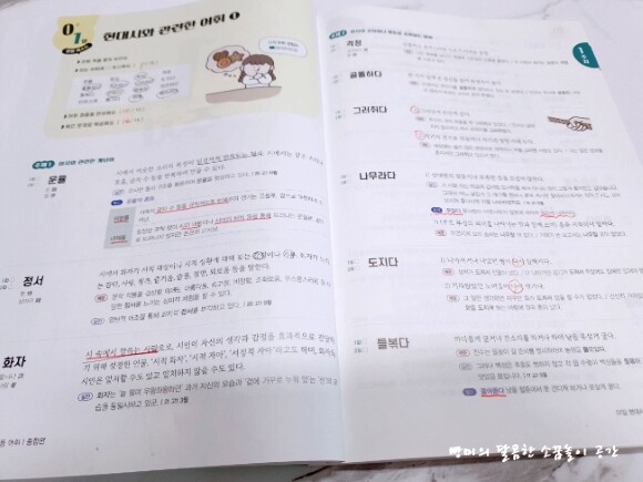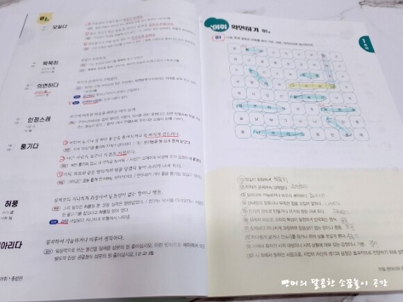 특히, 어휘 하단에 한자와 뜻을 표기해 준 부분과 어휘가 가진 기본 뜻 이외에