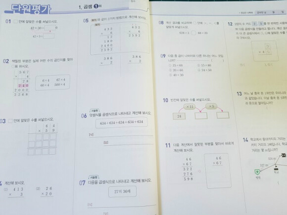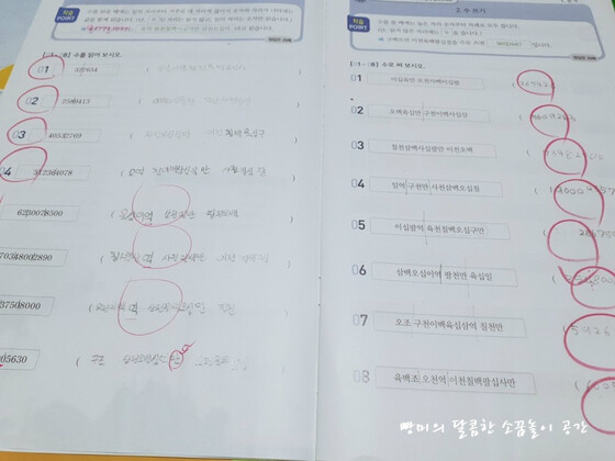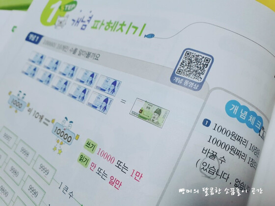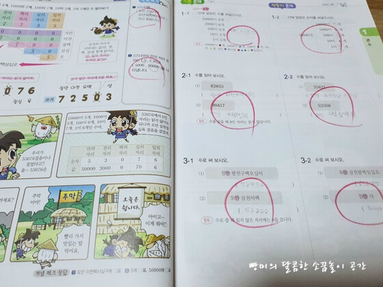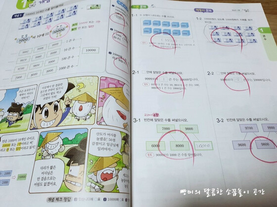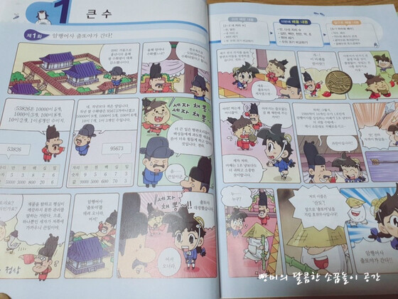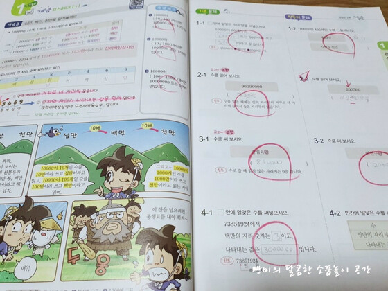 그런 문제들로 구성되어 있었어요. 4학년 1학기 첫 단원이 '큰 수' 로 네 자리 수부터 억, 조까지