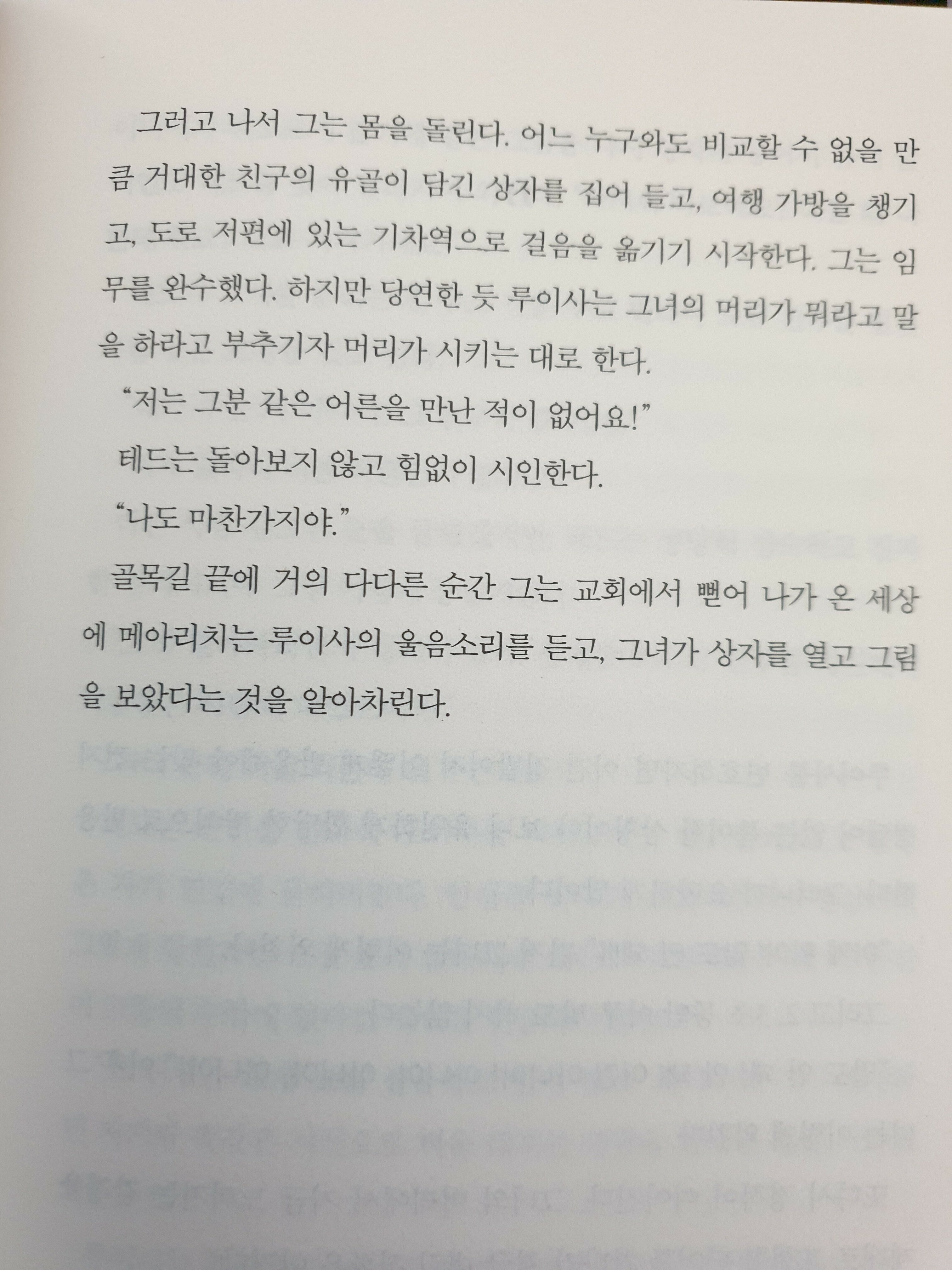 소설은 루이사와 테드의 여행을 하는 과정에서 테드가 천재화가 친구와의 추억이야기를 들려주는 과정으로 이어지며 테드와 루이사가 서로의 공감대를 형성한다. 테드 역시 과거속에서 피해의식과 공포감을 가지고 있지만 루이사에게 자신의 아픔을 털어내면서 어른다워야 한다는, 어른의 역할을 해야 하는 것에 대한 생각을 읽어가면서 공감을 이끌어 낸다.