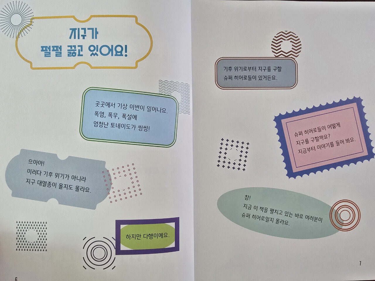 책의 주제는 기후변화, 환경오염, 지구 재난 같은 지구적 위기이며, 이를 어린이 눈높이에 맞게 쉽고 재미있게 풀어냅니다. 특히 단순히 문제점을 나열하는 것이 아니라, **“내가 좋아하는 것, 잘하는 것에서 시작해 지구를 지키는 히어로가 될 수 있다”**는 긍정적인 메시지를 전해주어 아이들에게 자신감과 동기를 불어넣습니다. 플라스틱을 없애는 발명가, 새로운 에너지를 만드는 과학자, 환경을 지키는 히어로 등 다양한 상상을 펼치며 과학적 사고와 창의력을 동시에 키울 수 있다는 점이 인상적입니다.