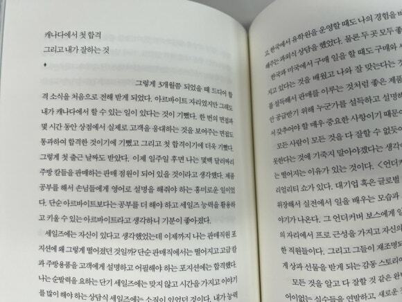 이 책은 해외에서 살기, 해외 취업에 대한 이상적인 로망에 대해 언급한 것이 아니라 자신이 주어진 현실에서 현재보다 더 성장하기 위한 것이 어떤 것이고, 그것을 실천하기 위해서 어떤 노력을 했는지 잘 보여주고 있는 책이다. 남들보다 못한 스펙을 가졌다고 했지만, 캐나다의 지구여행자를 만나 자신이 성장할 목표로 정했고, 그 목표를 달성하기 위한 기회를 만들기 위한 노력을 끊임없이 했다는 점이다.