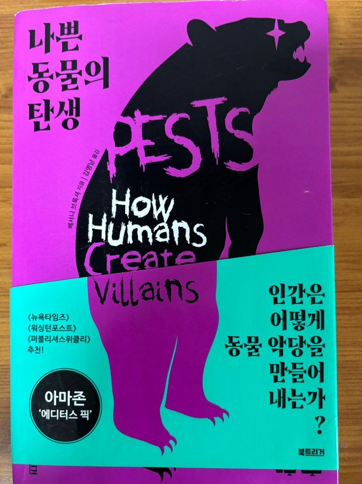 유발 하라리 교수가 쓴 “사피엔스”에서 이 지구상에서 가장 해로운 동물이 바로 인간이라고 했다. 동물들이 말을 할 수 있다면 하고 싶은 이야기가 아닐까 싶다. “인간 너희가 가장 나쁜 동물이야!!!”라고... 이 책을 쓴 저자가 하는 이야기도 인간들 마음대로 어떤 동물을 대상으로 해롭네, 마네 하지 말라고 한다. 이 지구상에서 다 함께 살아가는 처지에 누가 누구를 뭐라 할 처지가 되지 못하니 나쁘다고 낙인찍지 말고 서로 각자의 위치에서 사이좋게 살아가라는 것이 이 책의 핵심이다.