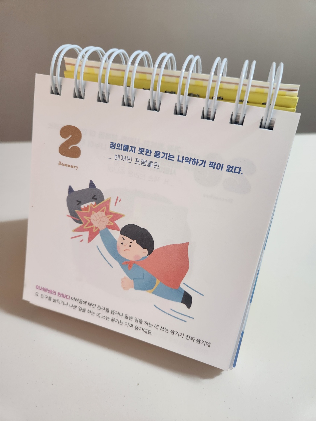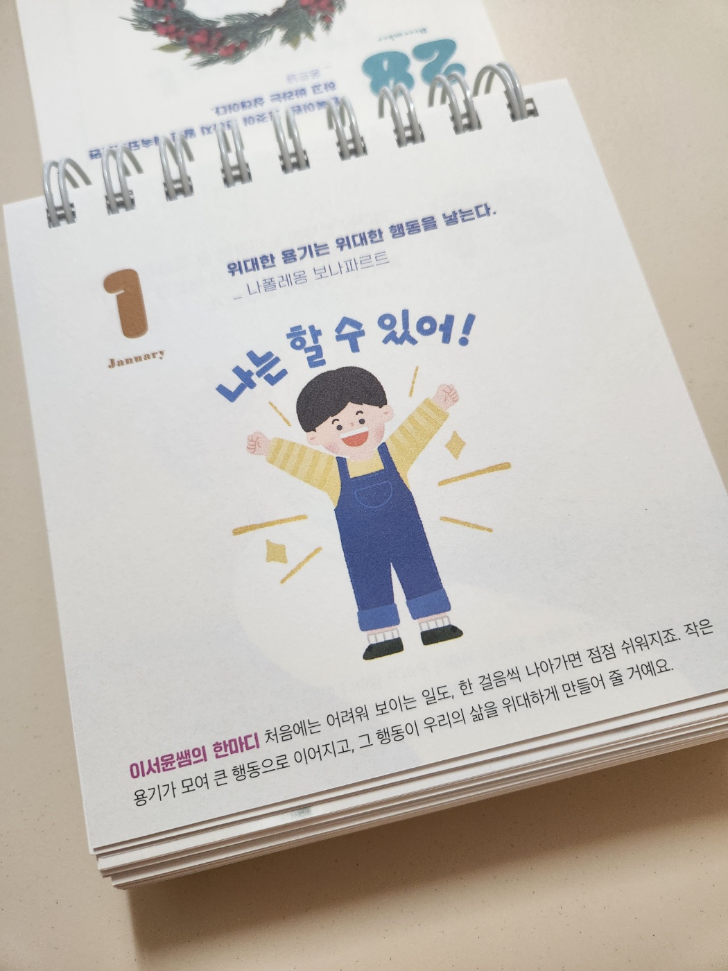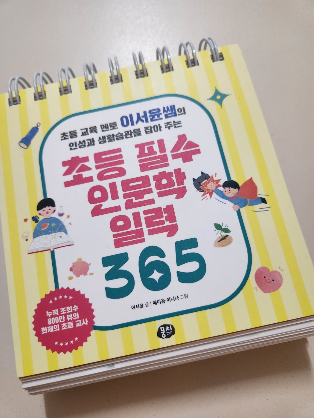 요새 하루 한장씩 볼 수 있는 일력들의 종류가 무척이나 많아 진거 같아요이런 일력을 식탁에 두면 아이들도 알아서 읽게 되더라구요 밥을 먹으면서, 아님 밥을 먹고 나서 날짜에 맞춰 그날그날 읽어보는 재미가 있더라구요하루하루 작지만 하나씩 알아가는 즐거움이 있어 일력이 좋은 거같더라구요이번 이서윤 선생님의 초등학생을 위한 인성 수업으로 인문학 일력 365가 나와서 너무 반가웠어요아이들이 점점 커가면서 인생의 가치와 덕목을 알아가는게 무엇보다 중요해 보였거등요용기, 배움, 우정, 행복 등 열 두가지 키워드에 맞춰서 풀어낸 것으로 스스로 자신의 가치를 발견하고 인생의 의미와 지혜를 배울 수 있도록 마련한 일력이였습니다.초등학생 아이들을 키우고 있는 입장에서 아이들의 인성 교육에 기초가 될 만한 위인과 유명인의 명언과 함께 아이들 일상속에서 작은 깨달음을 얻거나 실천할 수 있는 짧은 문장들이 실려 있어요.1월 1일 새해를 맞이 하기 전에 일력을 받았기에 바로 첫 해 25년 일력과 함께 시작할 수 있었어요.아이들도 새로운 일력에 관심을 보였고 책장을 넘기는 즐거움을 주는 귀엽고 사랑스럼 그림은 덤이네요.'나는 할 수 있어!' 용기를 주는 문장으로 시작한 1월 1일입니다.하루하루 어떤 글들이 있을지 너무 궁금하네요.아이들이 생활 속에서 겪을 수 있는 여러 상황에 대한 위로와 용기, 지혜를 전하는 짧은 문장이라 자신의 감정과 태도, 행동을 생각해 볼 수 있는 거같아요. 매일매일 하루 한장 읽으면서 스스로 자신의 마음을 돌보고 올바른 생활 슨고바을 기를 수 있을 듯해 너무 만족합니다. 아이뿐만 아니라 어른들도 이런 글을 읽다보면 마음의 울리는 ㅂ문장으로 인성수업이 가능하겠죠?오늘이 몇 월 며칠인지 확인도 하고 열두달 키워드에 어울리는 위이,ㄴ 또는 유명인의 명언을 알 수 있고, 그 달의 명언에 어울리는 그림으로 보는 즐거움까지. 또 가장 중요한 이서윤선생님의 한마디를 통해 자기 마음을 이해하는 것! 올바른 생활습관을 자연스럽게 배울 수 있어 너무 좋은 거같아요.오늘도 일력과 함께 하루를 시작합니다.25년 행복한 한해를 보낼 수 있을 거 같아요~ 이서윤쌤의 초등 필수 인문학 365 추천합니다.