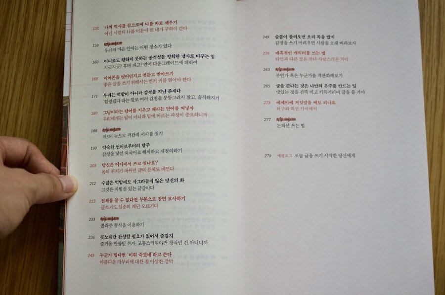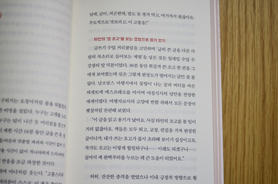 이 외에도 '자기혐오의 파도를 타라', '화려한 글 감옥에 갇혀 연필로 한 자 한 자 쓰고 싶지만', '너는 나의 팬으로, 나는 너의 독자로 그렇게 오래도록 함께 쓰자' 등 글을 쓰는 데 방해가 되는 것, 글을 쓰도록 독려하는 존재 등 읽으면서 내가 어떤 이유로 글쓰기가 힘들었는지 알게 되는 꼭지가 어디 한 군데에서는 꼭 나올 거예요. 그것을 극복하면서 계속 글을 쓰도록 함께 글을 쓰는 동료로서 보듬어주는 걸 느낄 수가 있더라고요.