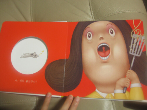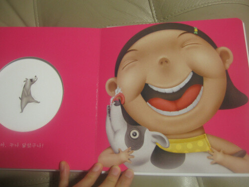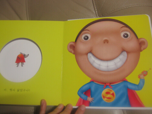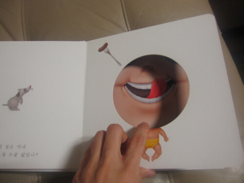 우선 구멍이라는 컨셉이 아이의 호김을 엄청 자극시킨다. 구멍을 열어보기 전에는 천진난만한 아이의 모습이었다가 구멍이 뚫린 책장을 넘길 때마다 가족의 얼굴들이 하나씩 펼쳐진다. 사탕을 들고 있는 아빠, 요리하시는 엄마, 인자한 모습의 할머니, 괴팍한 인상의 할아버지, 행복한 표정의 누나, 장난끼 많은 형아. 각자 다른 듯 닮은 모습의 그들은 하나의 가족으로 묶여 있다. 그리고, 정말 맘에 드는 건 이 책의 색과 그림이다. 아이를 키우면서 이렇게 예쁜 색으로 그려진 그림을 별로 본적이 없는 것 같다. 각 인물들의 고유한 특징이 잘 표현된 동시에 어딘가 모르게 닮은 모습들. 그들이 하나의 가족이라는 것을 상기시켜준다. 또한 관찰자로서 등장하는 강아지는 내용의 일관성을 더해주며 마지막에 재치 있는 반전을 부여한다. 그리고 이 책이 정말 좋은 건 마지막 페이지에 있었던 CD!!!!!!!!!!! 정말 최고다.