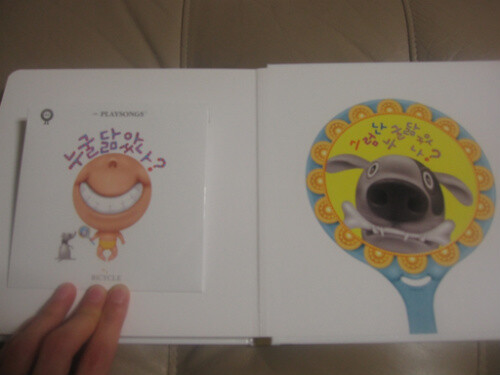 우선 구멍이라는 컨셉이 아이의 호김을 엄청 자극시킨다. 구멍을 열어보기 전에는 천진난만한 아이의 모습이었다가 구멍이 뚫린 책장을 넘길 때마다 가족의 얼굴들이 하나씩 펼쳐진다. 사탕을 들고 있는 아빠, 요리하시는 엄마, 인자한 모습의 할머니, 괴팍한 인상의 할아버지, 행복한 표정의 누나, 장난끼 많은 형아. 각자 다른 듯 닮은 모습의 그들은 하나의 가족으로 묶여 있다. 그리고, 정말 맘에 드는 건 이 책의 색과 그림이다. 아이를 키우면서 이렇게 예쁜 색으로 그려진 그림을 별로 본적이 없는 것 같다. 각 인물들의 고유한 특징이 잘 표현된 동시에 어딘가 모르게 닮은 모습들. 그들이 하나의 가족이라는 것을 상기시켜준다. 또한 관찰자로서 등장하는 강아지는 내용의 일관성을 더해주며 마지막에 재치 있는 반전을 부여한다. 그리고 이 책이 정말 좋은 건 마지막 페이지에 있었던 CD!!!!!!!!!!! 정말 최고다. 단순한 별책부록 CD가 절대 아니다. 그림과 함께 귀로 듣는 음악. 이 책의 내용을 더욱 풍부하고 알차며 재미있게 해준다. 책을 읽고 플레이송스가 어떤 곳인가 궁금해 찾아봤는데, 우리 아이들 같은 영유아들을 대상으로 음악놀이교육을 하는 곳이란다. 그래서 그런지 음악 역시 전문적이고 다채롭다. 우리 아가도 음악을 들으며 어찌나 좋아하던지... 내가 다 뿌듯했다. 수록된 음악들을 통해 시각과 청각을 동시에 자극하여 다각적인 발달을 촉진시킬 수 있을 것 같다.