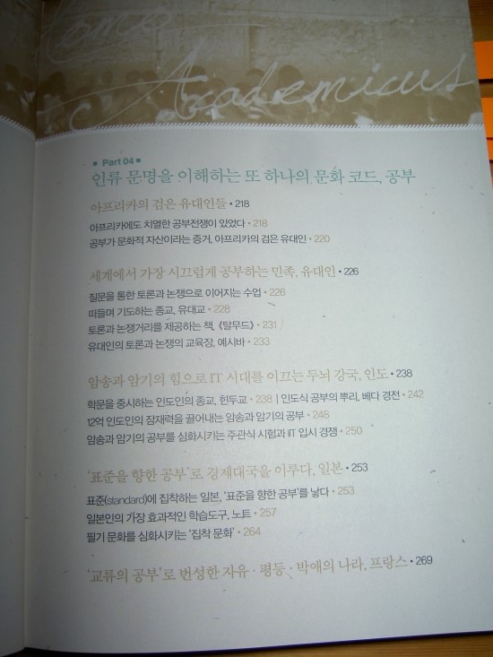 한 사회의 공부와 그곳의 문화, 삶의 방식은 서로 긴밀한 영향을 미치면서 학문적 성과를 만들어내고 고유의 문화를 지켜나가고 있습니다. 그렇기 때문에 유대인의 공부는 중국의 공부와 달랐고, 중국의 공부는 미국의 공부와 달랐으며 인도의 공부는 일본, 한국의 공부와 달랐습니다. 각 문화의 공부는 피부색 보다 더 달랐네요