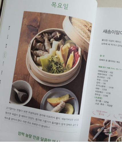 기본적인 찜기 사용법에 대해 친절하게 소개하고 있어 처음 찜기 사용에 대한 어려움 없이 도전해 볼 수 있도록 해 주네요. 뭐든 찌고 싶은 찜기 레시피는 일주일 찜기 레시피, 사계절 찜기 레시피, 동시 조리 찜기 레시피, 간단한 찜기 레시피의 기본 총 4챕터로 구성되어 살펴볼 수 있어요.