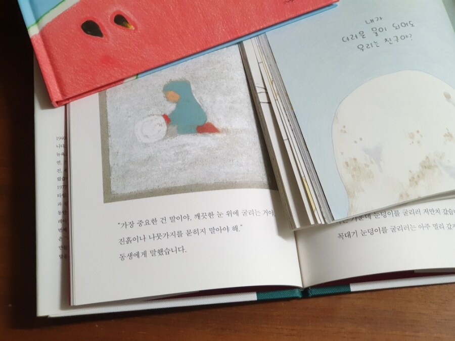 겨울의 한가운데 있을 때처럼 위풍당당 눈아이도, 햇볕이 따스해져 눈의 계절 끝에 서 있는, 자신의 모습을 잃어가는 눈아이도 모두 친구입니다. 친구라는 사실에는 변함이 없죠. 계절이 지나 다시 겨울이 오면 만날 수 있는 친구입니다. 위풍당당할 때만 친구인 것은 아닙니다. 내가 나의 모습을 잃어갈만큼 힘들 때 나의 손을 잡아주는 이가 누구였는지 떠올려보면 가족과 함께 친구가 있었습니다. 하얀 눈덩이든, 더러운 물이든 친구는 친구입니다.