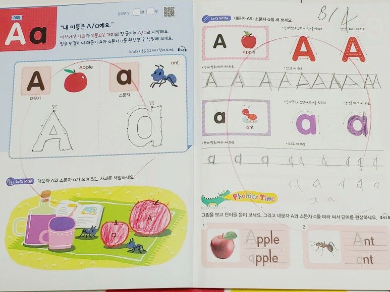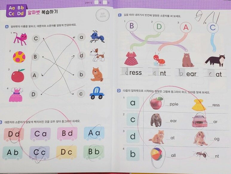 단어가 나오긴 하지만, 알파벳을 배우는 중이니 대문자/소문자를 찾거나 연결하는 정도의 문제에요.