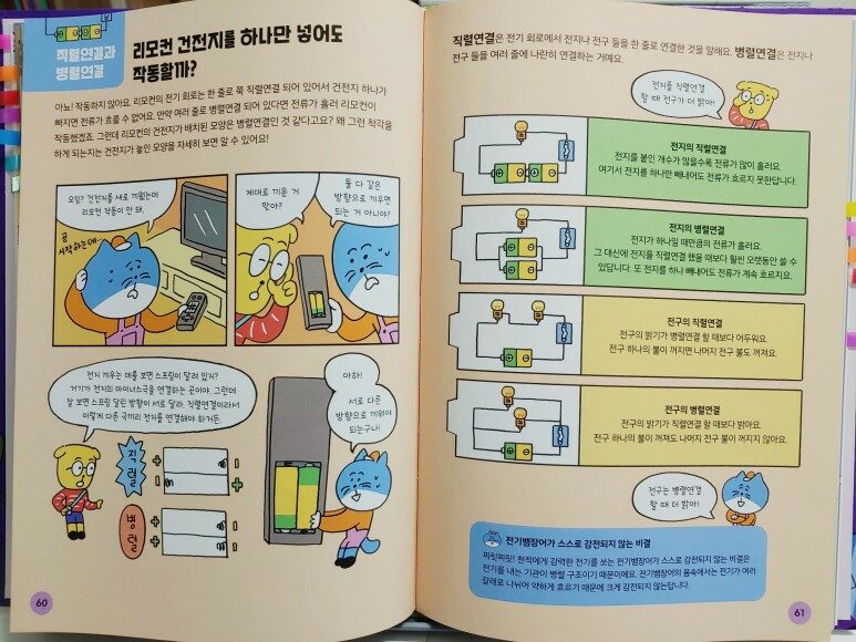 전기회로 만들기와 건전지의 전극(+,-)과 직렬/병렬 연결에 대한 설명이 추가로 되어 있어요.