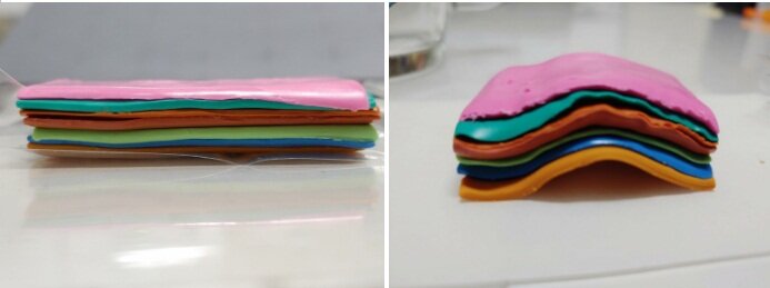층층이 쌓은 점토를 양 옆에서 힘을 가해서 습곡을 만들었어요.