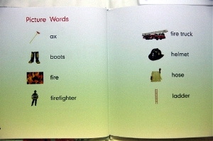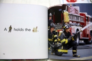 그리고 소방관 아저씨들이 입는 옷과 헬멧, 장화등과 불을 끌 때 필요한 도구를 소개하고 있어요.