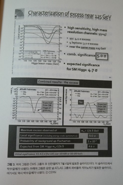 두 가지 계측기와 이를 운용하는 CMS, ATLAS 그룹 각각의 발표자료는 공통으로 125GeV의 피크와 5시그마의 통계적 확실성을 제시하고 있다. CERN의 이러한 발표를 직접 본 듯 읽을 수 있어서 재미있었다. 물론 모두가 그렇게 재미를 느끼지는 않겠지만, 개인적 느낌은 그랬고 또한 많은 독자들도 나와 비슷한 생각을 가지지 않을까?