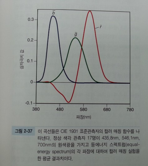 그러면 빛(light)의 삼원색은 무엇일까. 바로 빨강(red), 녹색(green), 파랑(blue)이다. 왜 이런 구성을 가지냐하면 바로 관측자의 시감도, 즉 눈의 민감도가 이렇게 구성되어 있기 때문이다. (추상체에 대한 이야기로서, 흑백에 대한 간상체 등 전반적 내용은 다른 서적을 참조 바란다.) 위 그림은 CIE 1931 표준관측자의 컬러매칭 함수를 보여준다.