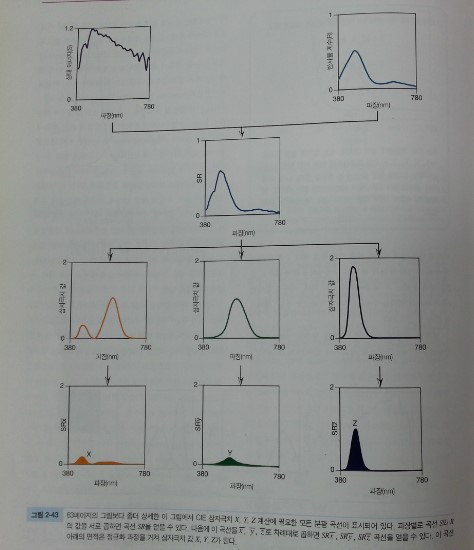 위 그림은 광원과 물체의 반사특성에서 나온 값을 눈의 삼자극치로 분해하는 과정을 보여준다.