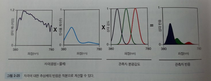 쉽게 이야기해 물체가 보이는 것은 (1) 비춰주는 빛과 (2) 물체의 반사특성과 (3) 관찰하는 눈이 있기에 가능하다. 어느 하나라도 없으면 색은 없다. 빨간 사과는 어두운 방에서는 검게 보인다. 적녹 색맹에게도 빨갛다는 말은 의미가 없다. 광원의 에너지와 물체의 반사율과 관측자의 시각감도가 모두 곱해져 물체의 색이 구성된다.