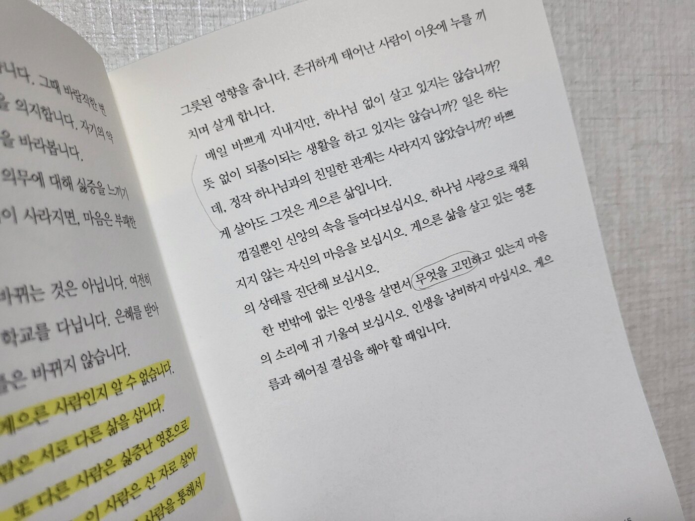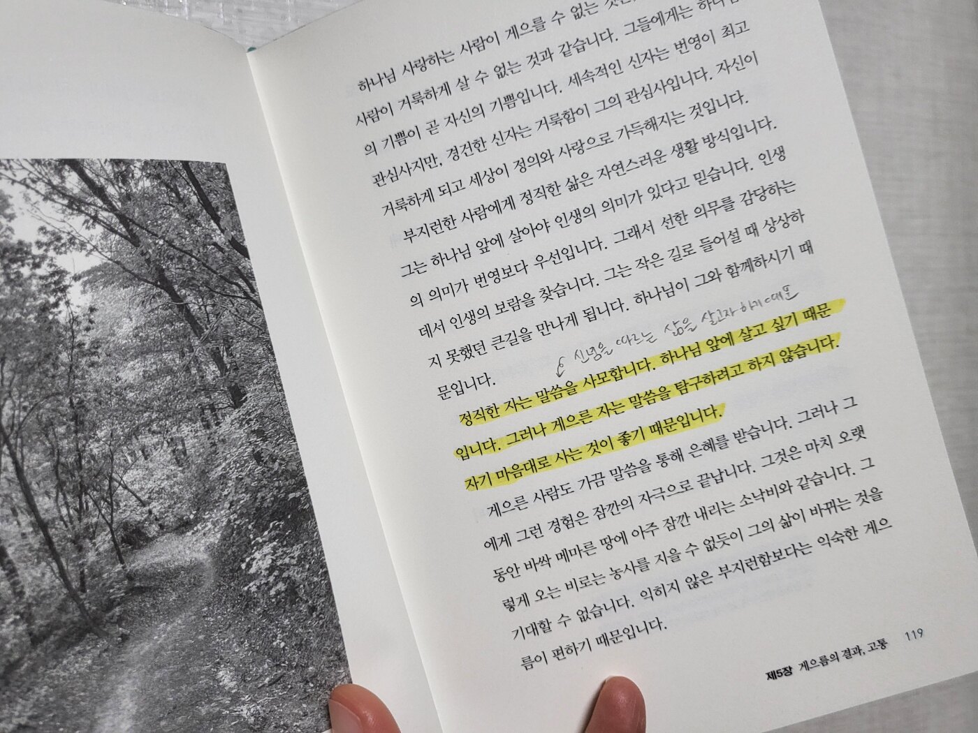 3. 나는 스스로 아주 성실하게 살고 있다고 생각해 왔다. 잠을 더 자느라 할 일을 미루지 않았고, 하고 싶은 일을 해내기 위해 시간을 쪼개어 살고 있기 때문이었다. 그런데 책을 읽다가 이러한 나의 열심이 가끔 '어디서부터 시작됐고, 무엇을 위한' 것인지 잊어버릴 때가 있다는 것을 깨닫게 했다. 어쩌면 매일 나의 일상에서 느끼는 세밀한 동행 하심에 감사하는 것으로 '충분하다'고 합리화하지는 않았을까.