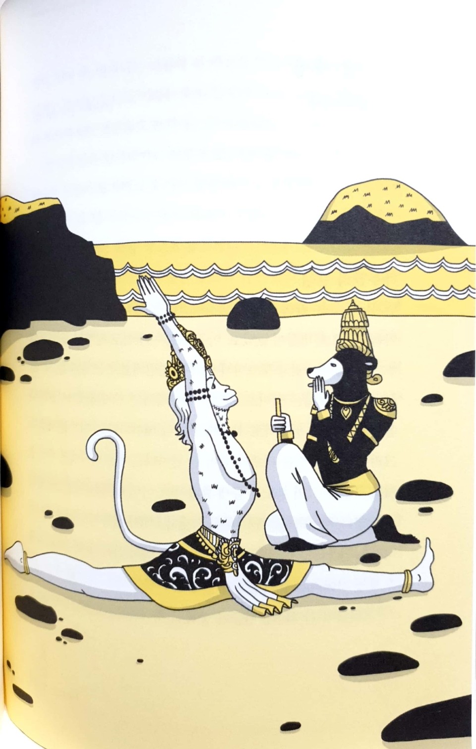 45가지 아사나 중 원숭이 자세로 풀이되는 하누만아사나 (엄밀하게 원숭이는 아니고 원숭이 형상을 한 반신)로 책의 분위기를옮겨 보면 힌두교의 베다 경전에 이어 중요하게 간주되는 라마야나대서사시 속 하누만의 이야기로 시작한다. 라마를도와주던 하누만은 더 이상 그를 도와줄 수 없는 상황에서 자신의 잊고 있던 능력을 발휘한다. 라마를도와주기 위해 용기를 낸 하누만의 충성심이 드러난 자세가 하누만아사나라고 저자는 해설한다. 이 자세에서우리는 헌신과 겸손을 배울 수 있다. 경박스러운 원숭이 본능을 잘 잠 재우고 바람의 신의 아들로서 라마를도와주는 헌신이 이 자세에 녹아있다고 한다.