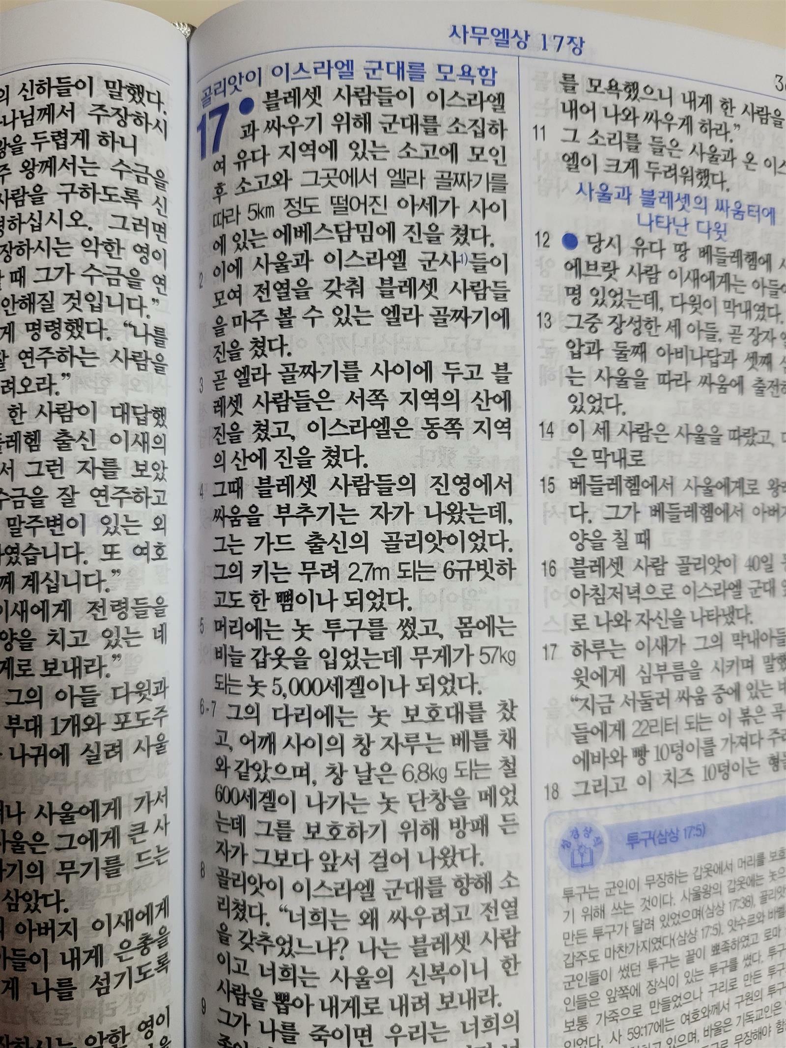 그런데 아이들이 이제 <새한글 성경>으로 말씀을 접하다 보니, 내용 이해가 훨씬 쉬워졌습니다. 어려운 용어들을 우리가 일상으로 쓰는 언어들로 잘 표현해 놓았기 때문입니다. 감히 저는 한국판 <메시지 성경>이다 라고 생각합니다. 또 제가 예시로 삼상 17장 말씀을 찍어서 올렸는 데, 우리가 너무 잘 아는 골리앗에 스토리가 거기에 담겨 있습니다. 4절을 보면 골리앗의 키가 여섯 규빗 한 뼘이라고 되어 있습니다. 한 번에 이해가 되지 않습니다. 골리앗이 엄청난 거인다 라는 것은 다른 그림이나 영상을 보고 이해를 하지, 그 구절 자체를 통해 엄청난 거인인 것은 한 번에 알기는 쉽지 않습니다. 그런데 <새우리 성경>에서는 한국의 미터 단위와 함께 기록을 해 놓았습니다. 골리앗의 키가 2.7미터라고 병행하여 기록해 놓았습니다. 아이들이 참으로 쉽게 이해합니다. 농구 선수 누구는 키가 얼마인데, 그거보다 몇 센치가 더 큰거야? 라고 하면서 골리앗의 키를 쉽게 유추해 갑니다. 이렇게 친절하게 성경이 되어 있으면 더 많은 사람들이 성경을 더 쉽게 접할 수 있지 않을까요?