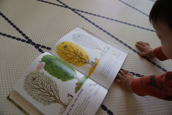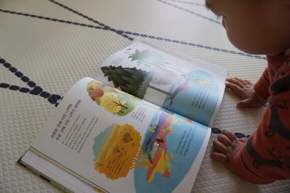 아이가 책을 보다가 마치 나뭇잎을 줍듯 한번씩 만져보네요