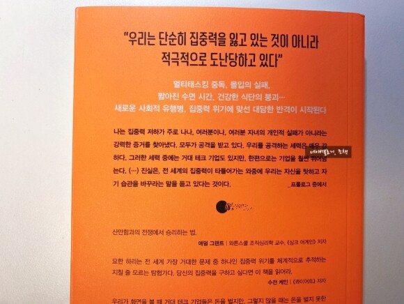 저자는 이 책이 자기계발서가 아님을 분명히 밝힌다. 그러나 이 책은 자기계발서가 아니며 저자 역시도 집중력과 관련한 이 문제를 완전히 해결하지 못했음을 먼저 인정한다는 것이다.